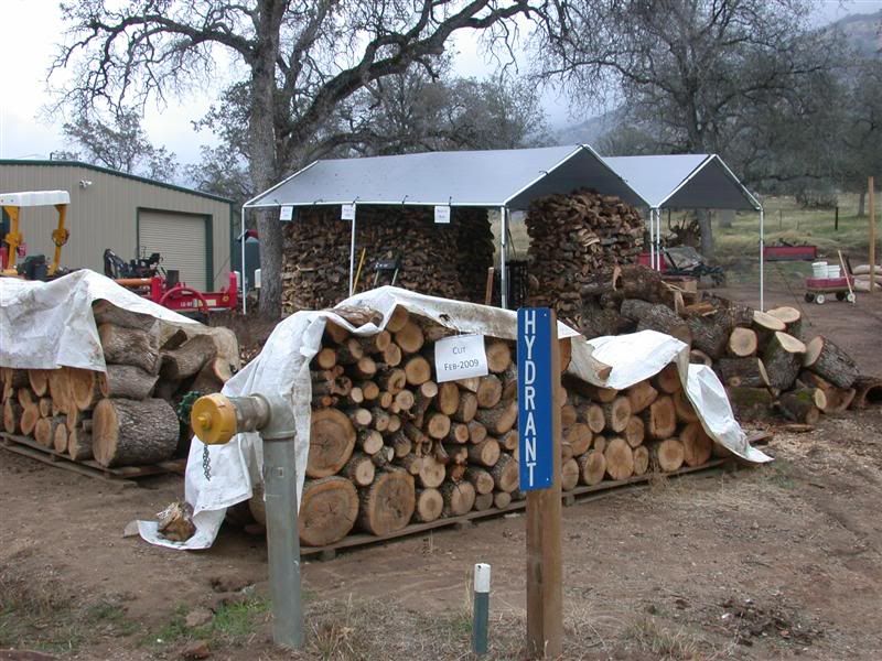 We still have several piles of already cut-to-length firewood that needs splitting. We run the log splitter off of her Jinma using that new detented Prince stack valve I installed earlier this year. We have a lot of wood (more since these photos) ... maybe twice as much now? You can see the stacks are about 7 to 8 feet tall under the 10' x 20' canopies. They are both full to gills now.