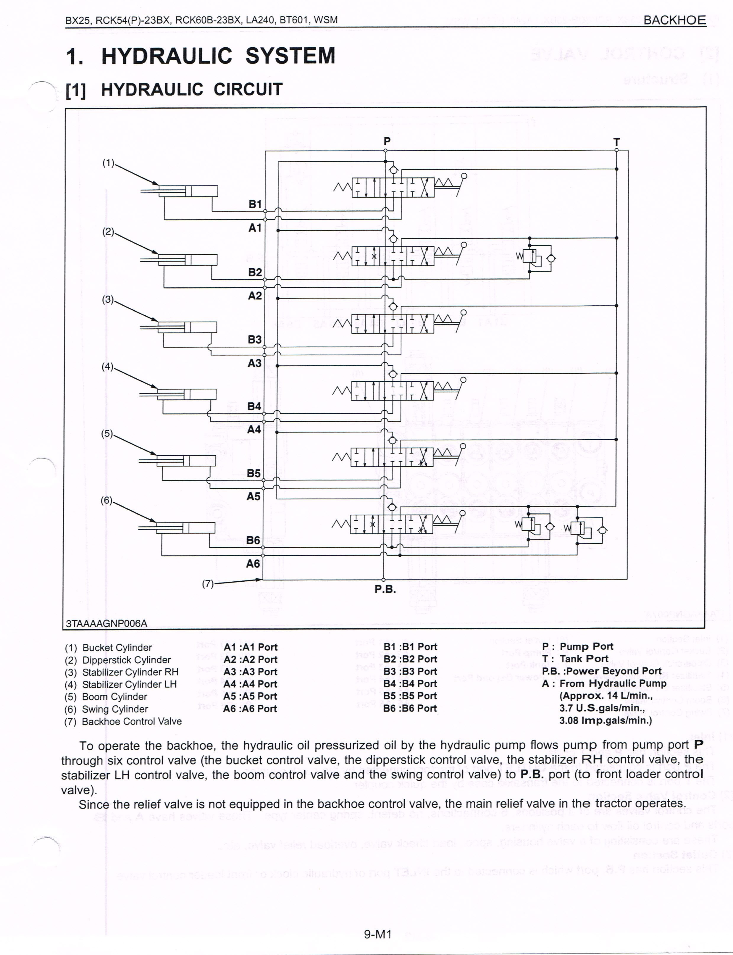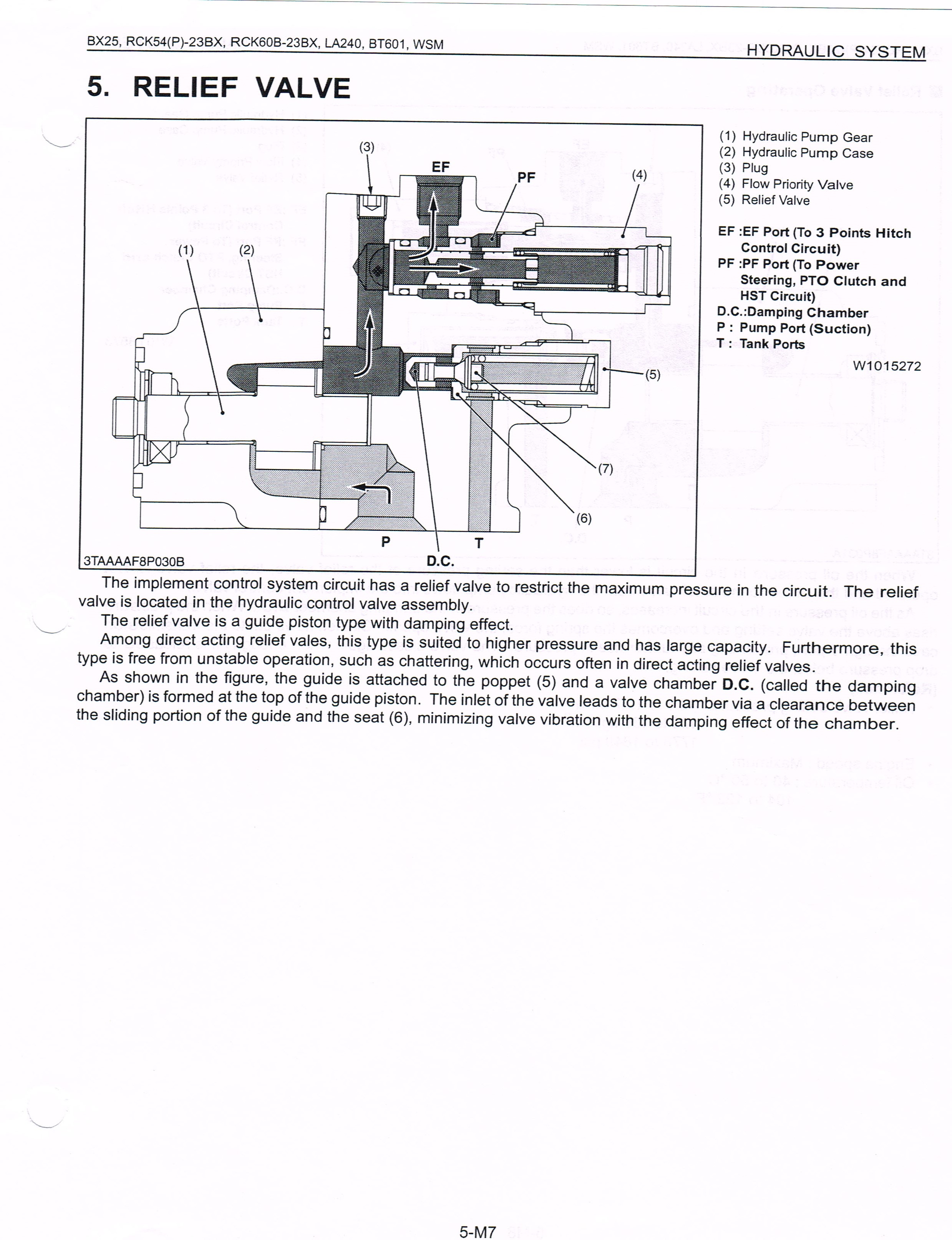 JJ, The main circuit relief is an attachment to the HST housing and it is the main relief for the attachment and 3PT circuit. What you may see as a relief valve at the BH valves is what they call a Load Check Valve in one place and an overload relief valve in another (appears to be one assembly performing both functions). There is one in the bucket valve and 2 in the swing valve. They are spring loaded but not field adjustable. The FEL has no relief valve. Attached are some more drawings. Reading the WSM manual it comes clear to me as it seems well worded and complete; I think.