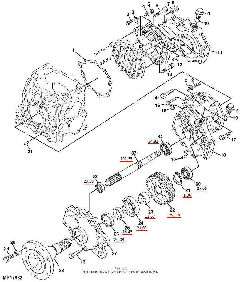 My gear (#22 in the JD Catalogue printout below) has 46 teeth, a total diameter of 144mm and a tooth width of 35mm. Could anyone confirm that this is the same as the JD part number M807858?