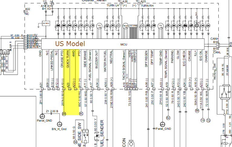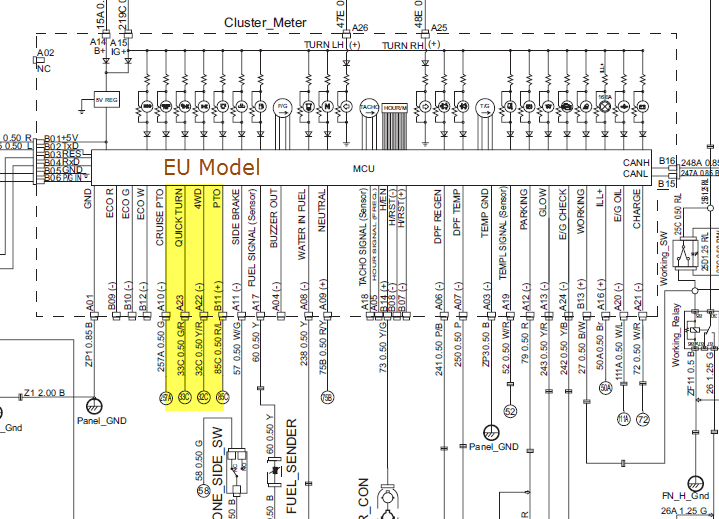 No. Some of the lights are only active on the European models. The lights are in the dash but only light during the initial "test" when you turn on the ignition. Traced out the wiring diagrams and could see the terminals on the MCU on the US drawings have no connections but on EU drawing it shows circuits for 4WD and QT (for example) that are not available here. I looked to confirm whether the wiring harness had anything near the switch location to tie into for adding a micro-switch to the lever but the wiring (for the switches) is not there, also indicated in drawing. The switch would be right above the parking brake. Nothing for QT/4WD but that is where the OBD2 port is. The QT (quick turn) feature uses steering position sensors to bias the hydro to the rear wheels to assist steering.