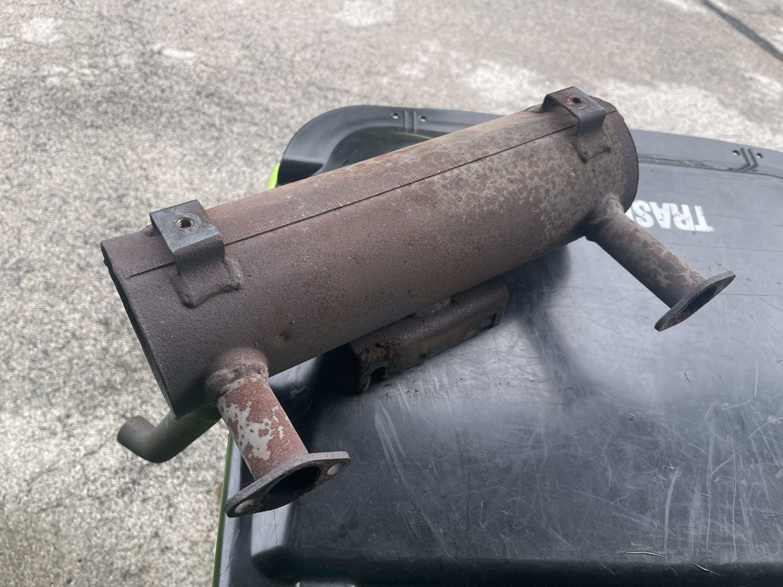 Here's the one I took off. I know the previous owner told me he'd replaced the muffler, and I'm guessing this is one that he had fabbed since the bracket is just welded on, as is the exhaust pipe: