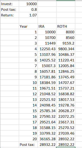 I *think* you are suggesting to create another column for a ROTH investment of $10,000? If so, I don't see the point. It is no longer an apples to apples comparison. If I invest more money, I would obviously expect it to grow to more money.