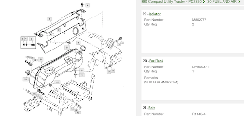 Its a Yanmar fuel tank. If you know the size in liters, I can provide you with the searchable p/n's.Need to replace fuel tank on my 990 compact, since there are no replacement tanks available I'm trying to decide how and where to place an auxiliary tank...any advice would be appreciated...