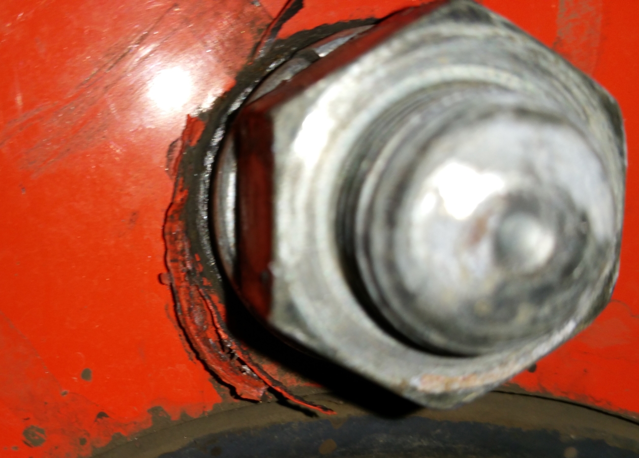 The front wheels have tapered nuts (like a car) but the rear wheels are just a flat bolt with a lock washer (two are studs with nuts and a lock washer). It's an extremely small amount of surface area to secure the wheel. Until recently they have never loosened up. To this day the right wheel has never had a bolt or nut loosen up (that's picture I posted). I posted that picture because unless you clean your wheels and look closely you may assume, like I did, everything is fine because you didn't find anything loose. On the good wheel the holes are not "egg" shaped. Adding lock tight or longer bolts with a nut on the back would do nothing to solve the problem. Again, the holes from the factory are too large.