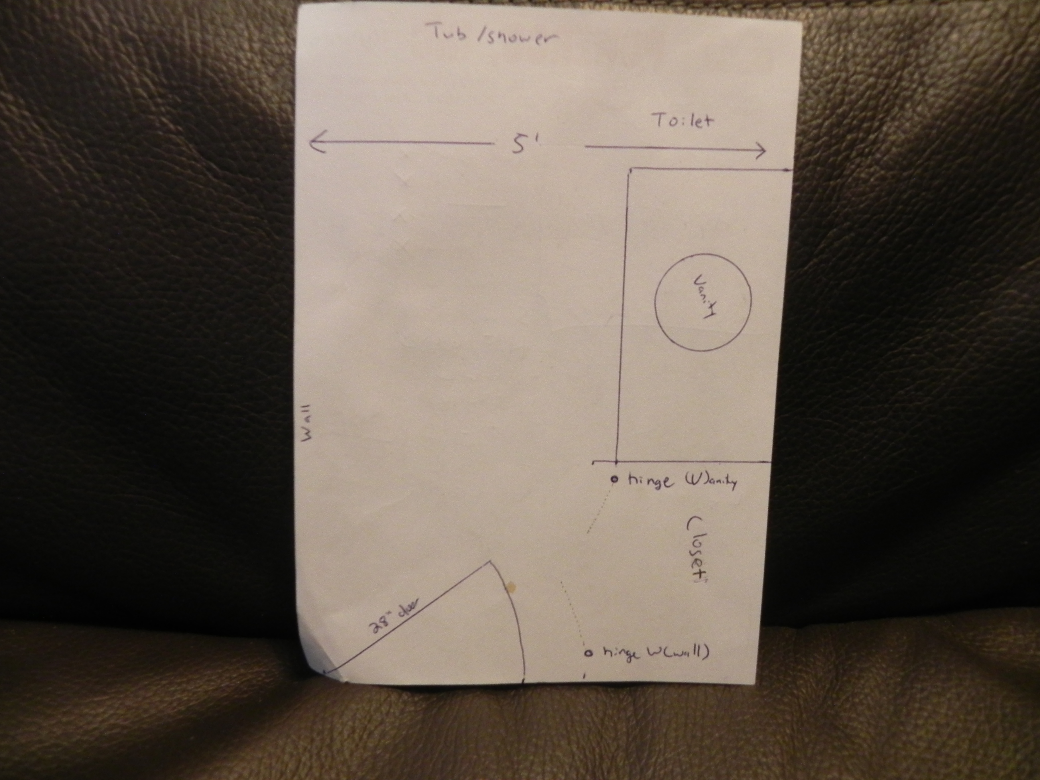 Hopefully you can get a general idea from my rough, mostly to scale sketch. 'V' for hinge near vanity, or 'W' for near wall. The new closet door would likely be about 24", so it would hit the main bath door if trying to open both at same time, but if main door already open, no issues...