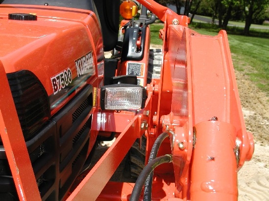 Sometimes things work out better than they should. The pics below are the added lights on the B7500 around 2010. They were mounted between the hood and the loader frame and lower than the headlights. They worked remarkably well year round. You can see that when the loader was at a certain height they hit the back of the bucket. The main reason for adding them was for mowing. The factory headlights were the typical worthless variety. These were old school Tractor Supply halogen floods. The spread was such that two of them gave a nearly 180° of lighting in front of the tractor.