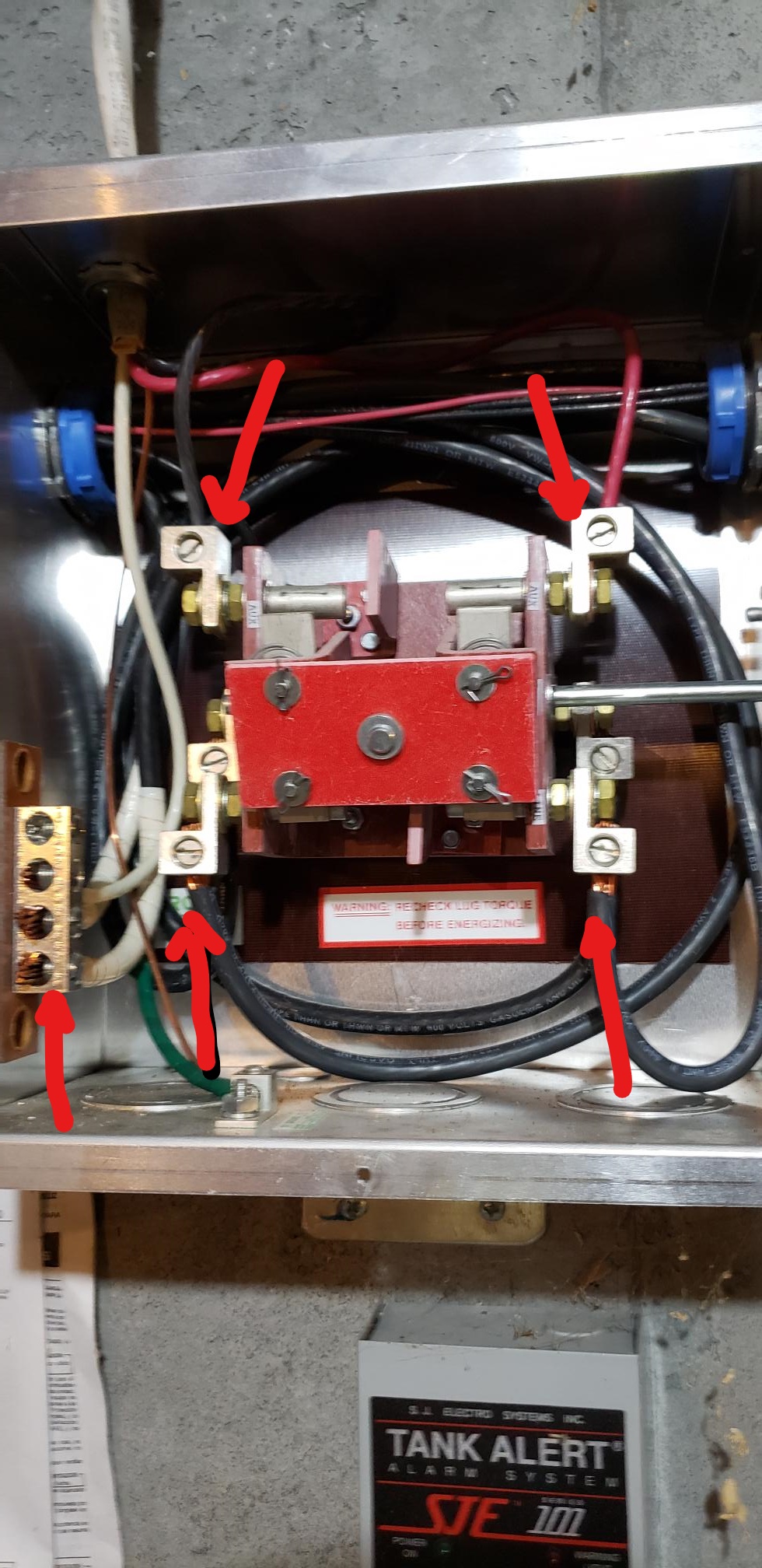 If you look at the transfer switch, it is a 240V switch. There are two black live wires and a white neutral for the line and for the aux we have a black and red live wires and a white neutral.