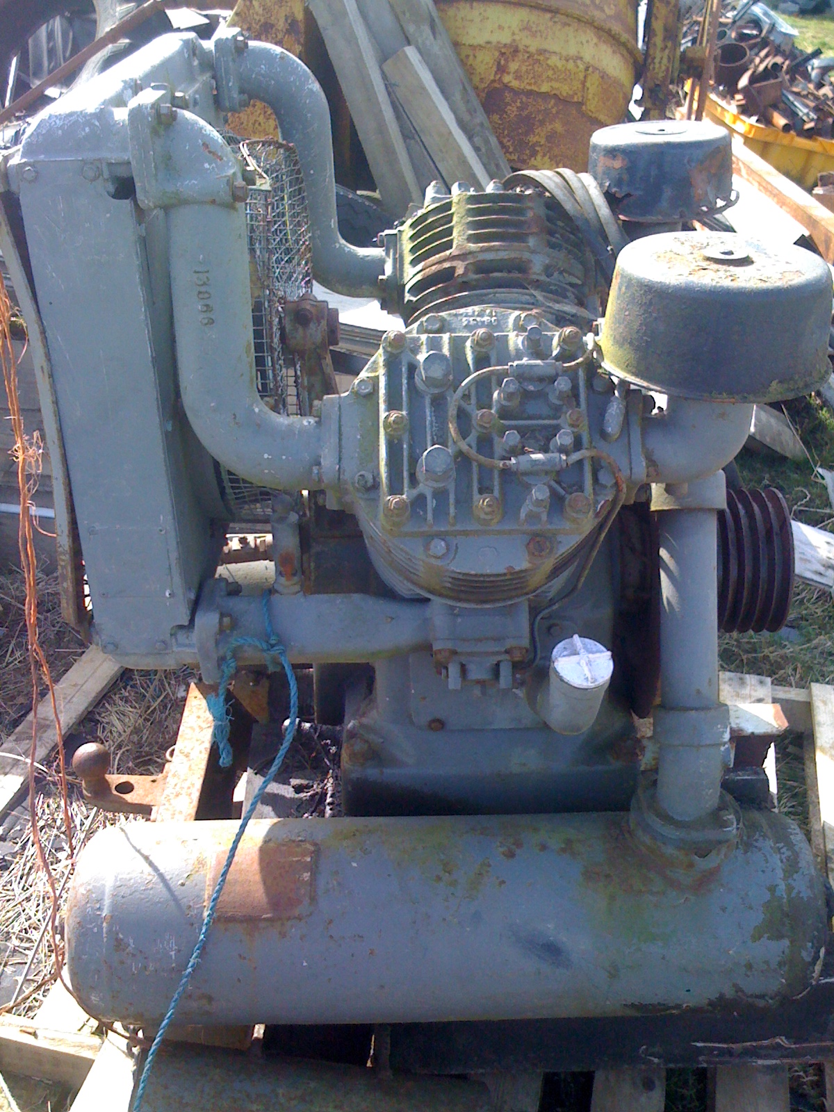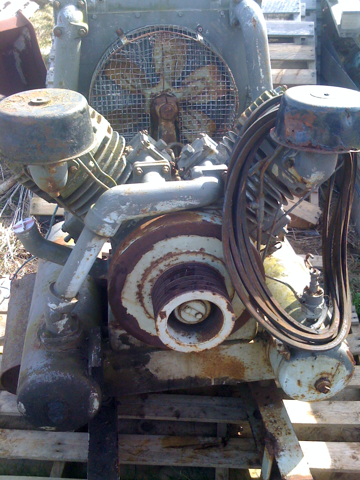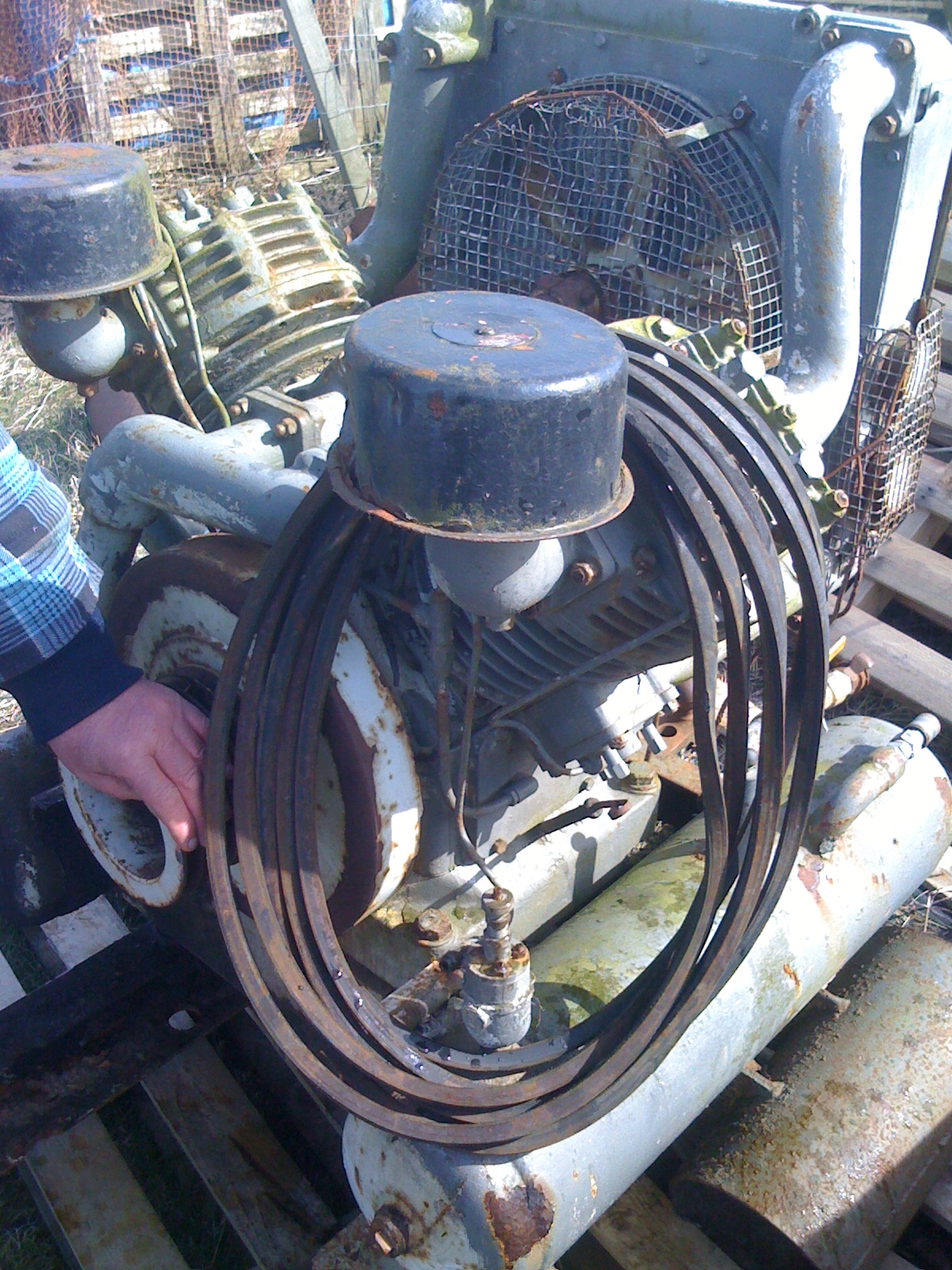Ive just bought an air compressor,it was cut off a tractor,what type i dont know,its a monster of a V shaped twin cylinder pump,with oil cooling rad and fan,driven by the PTO ,via an unknown type of pulley( it didnt come with the pump), and then onto the pump pulley with grooves for 3 or 4 V belts.,its has two long tanks either side,underslung and two outlets,one with a crows foot type connector and another large push fit airline connector,it was fitted on a tractor which was used for road maintenance,for these air / jack hammers they used,so its putting out a fair amount of psi.It still has the original chassis attached where it was cut off using a cutting torch,channel sections.Ive searched the web and all i can find are small pto attachments,I would like some info on this type of machine,maybe someone will know what it is and the revs/pm i need to set it up,im reluctant to drive it off my pto ,.i have a feeling it will need high revs for long periods while im working with it.So Im thinking a stand alone engine will be more suitable.(I will post pics later,sorry I know its useless at the moment without pictures of the actual pump...)