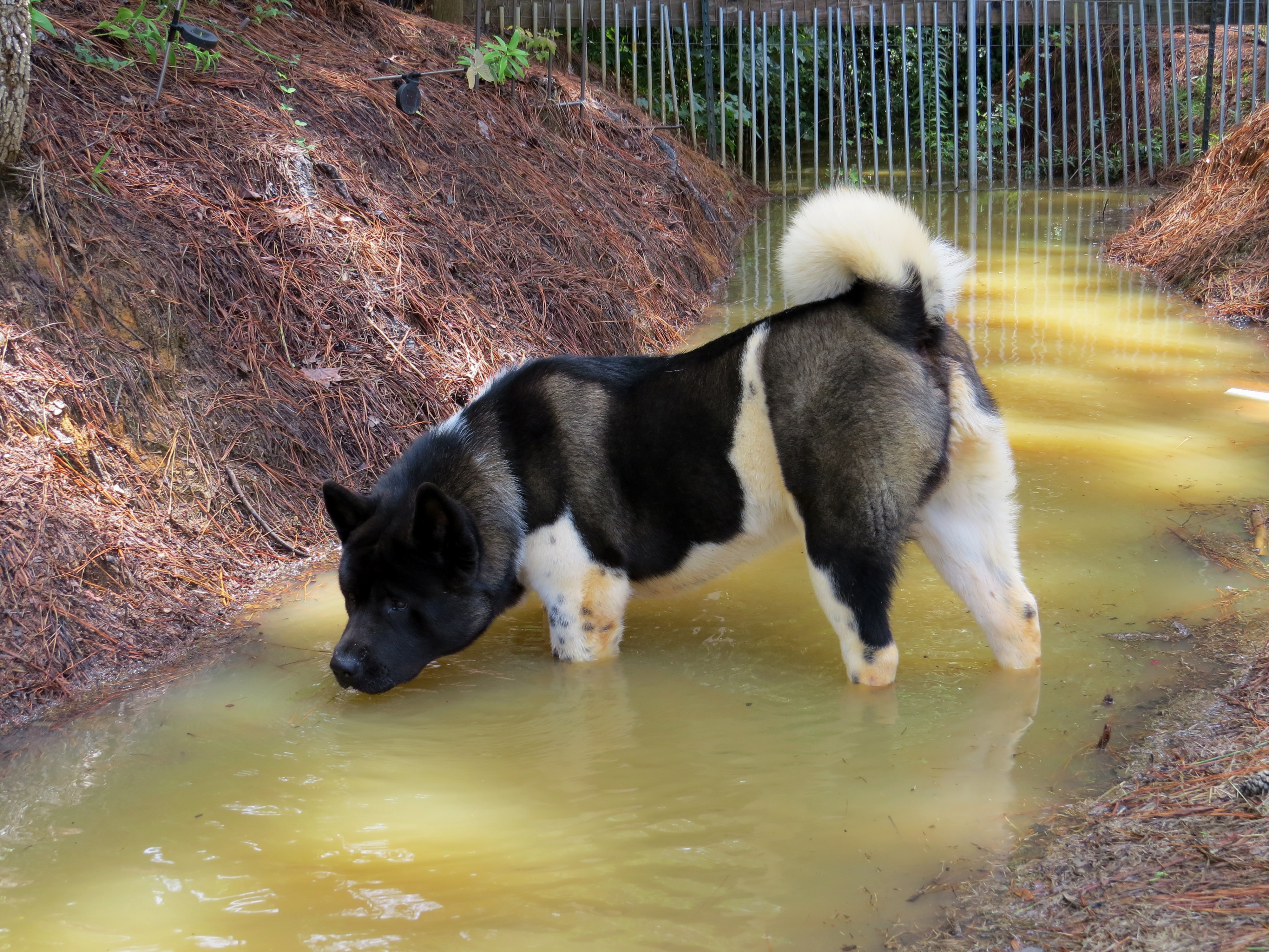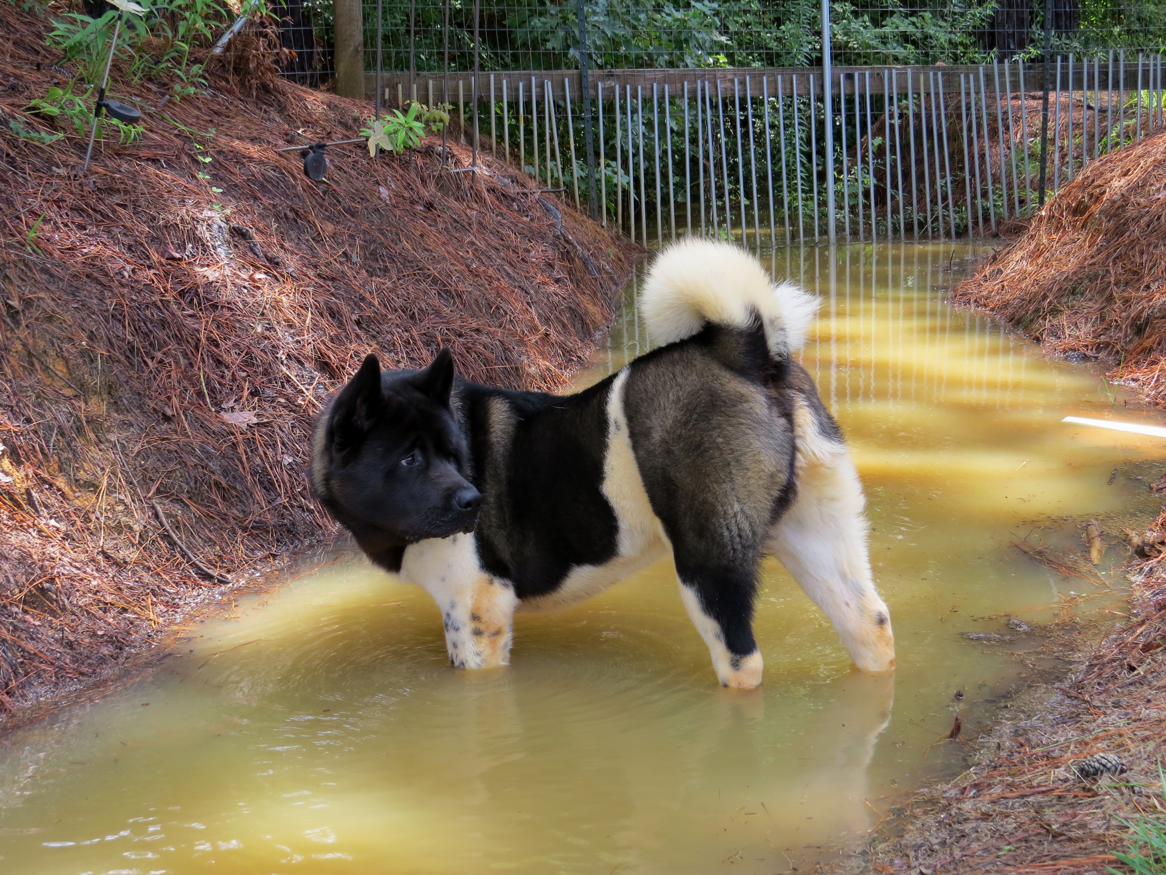 We've been having quite a bit of rain this week and my small pond is overflowing through my back yard. This water flows through ditches that I've dug to my big pond, so it's a good thing. Matsu loves the water and is enjoying it while it lasts!!!!
