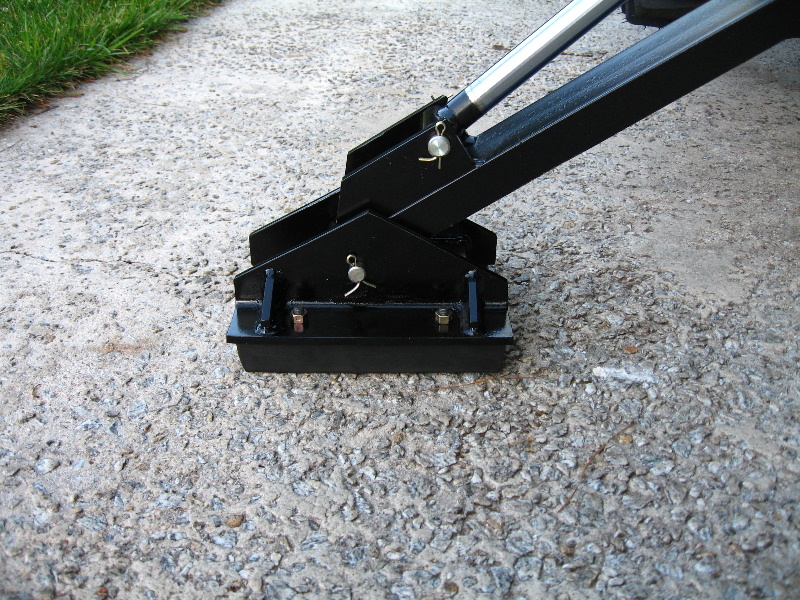 there small and just 4 little spikes. and thay have only minimal lift. and pavement work is out of the question :( . why JD dropped the ball on this i will never know:rolleyes: . after a very long search to see if anyone made a flippad for dirt and street for the 46 hoe . I found very little. and what i did find , i figured i could do it better..( and i did )...:) Big thanks go's to Brett6284D for sending me detail pictures of his 448 foot , so i would have a pattern. and i went to work. this was quite a job to figure all the geometry for it to work perfect. 46 and 448 leg is different. and i could not use just plain steel it would soon fatige and bend. so i finally located some very i tensel steel. man was this hard to cut and work. i bought a set of 448 street pads. and thats what i built them off of. There monsters....:D I changed the geometry a bit. as you will see. tractor lifts like a 3720 with a 448 now. quite a bit higher than the factory 46 does . with a much larger foot print. and thay flip right over to work in dirt or street. it uses the factory pin and cotter keys. and looks like thay came on the tractor. the way JD should have done it in the first place. and ya it does make the tractor look mean , and gives it some subtance. and much more stable on slops. thay were expencive and time consumeing to make but i felt it was needed and worth it. Your probebly saying. Well Do Thay Work???