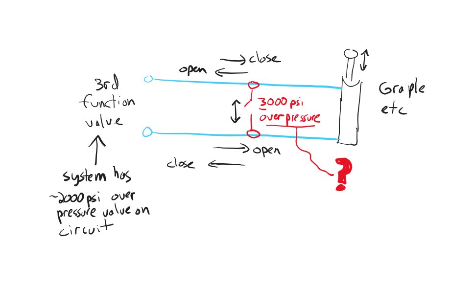 Just for clarity: If the diverter is running the grapple, and sharing the function of the bucket hydraulics, the hydraulics to the grapple are isolated from the relief valve in the FEL valve when the diverter is closed. That is where the overpressure issue arises.