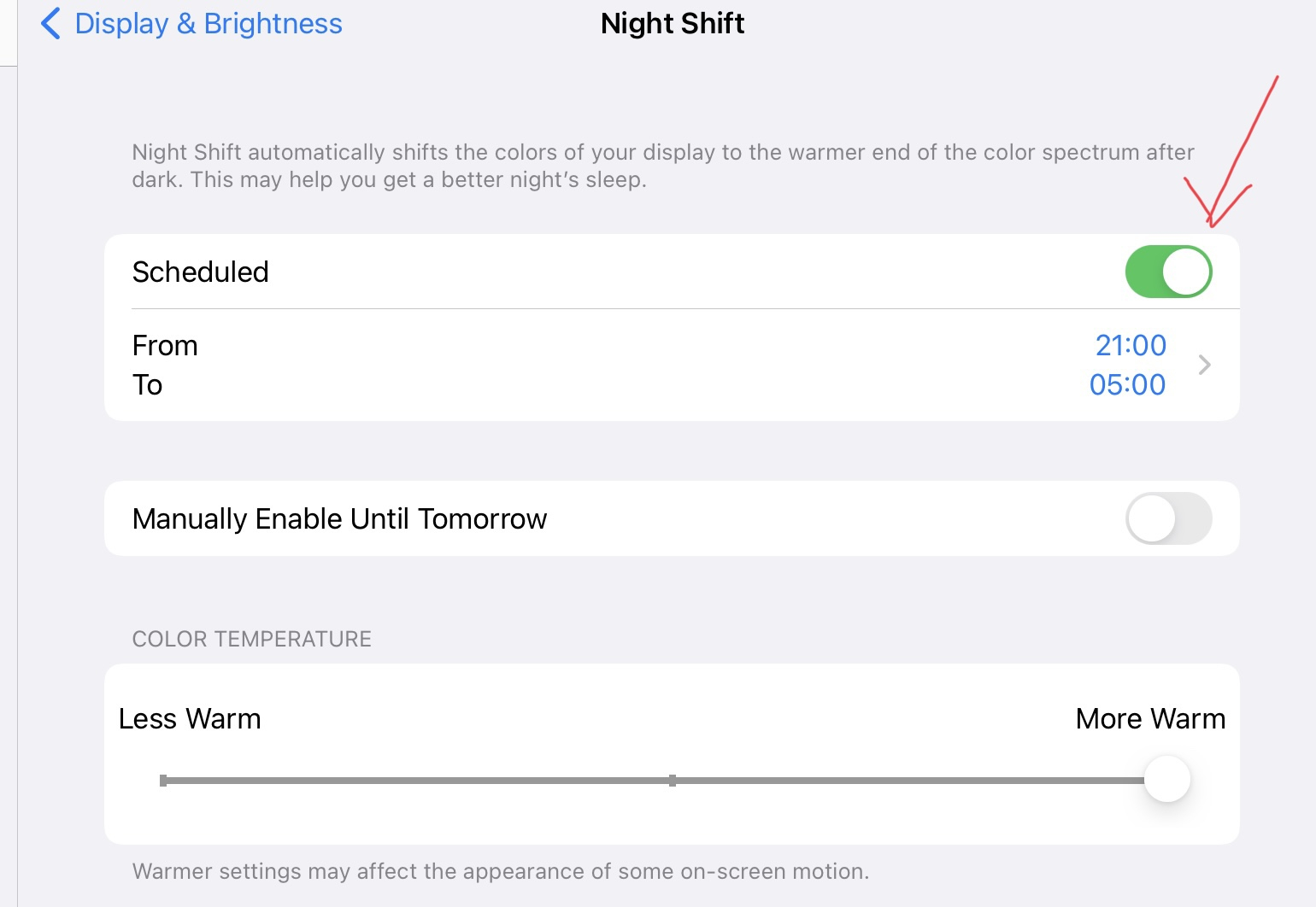 Yeah, based on JethroB's suggestion we both started using it. We noticed, however, that it is not a permanent setting - you have to reset it each night - I suppose each time you turn the ipad on. It's one of those things, though, that will be difficult to assess- i.e., whether, or how much it is helpful - but we will continue using it. We also bought some clip-on blue blocker glasses. Again, hard to assess the overall positive effects - old eyes do get tired.