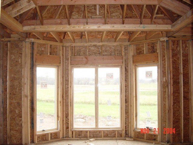 Here's a shot of the master bedroom framing. It has a bay window that looks out the back of the house toward the pond. The ceiling is recessed with indirect lighting in the coves.