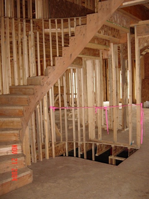 Here's a shot of the staircase in the entry. It created quite a challenge for the rough in crew as well as the trim carpenters. Forming the oak handrail was quite a chore.