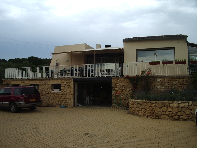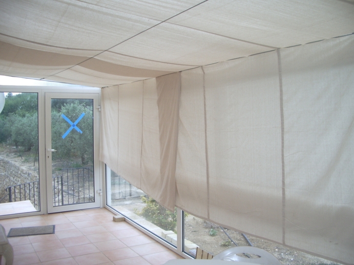 I had a secondary project. In our Guest House there is a sun porch and gosh almighty it is hotter then heck in there in the summer. I can't imagine what the previous owner was thinking building that. The roof is all plexiglass and the sides are fixed glass with about 1/3 of the wall beig sliding glass windows. We rent out the guest house for vacation rentals and I needed to get some protection form the sun, oh yeah it faces west on top of it. I did'nt want to go up on the roof twice a year to put up and take down a covering and I needed something real low budget, we ahve after all only had 3 harvests of olive oil so budget was a big factor. At Cover Me Tarps and Canopies they had painters cloth real cheap, I think I paid $15 for a 10' x 12' piece so I used that for inside the sun porch of the guest house, again using the steel wire and tenders to connect to the aluminum frame fo the sun porch. i bought L shaped elbows with two holes. The hole closest to the center of the room is to hold the fabric on the ceiling and the second hole, closest to the wall will be to hold long curtains. When I can borrow a sewing machine I can cut off the painter cloth fabric that is hanging over the windows and sew it up to just the size of the ceiling, and then have nice drapes on the rest. For now it hangs down and does what it is supposed to do, it blocks out the sun.