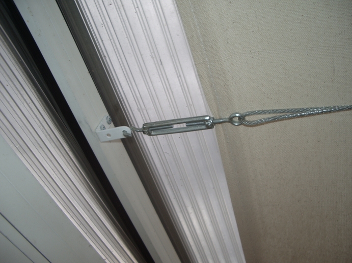 In the pics you will se the steel wires hanging off the sides of the pergola. I just used those zip tie things that you used to bundle wire together and secured them to the frame so now everthing looks neat and tidy. I did not use tenders for every grommet, mainily jsut for the corners and a couple extras in the middle, but for the rest of the grommets i used those wire zip ties (srry I don't knwo the official name for them but i think you know what they are). We have had winds i would say that were 50mph winds and it works ike a charm. The bottom edge of the upper tarp lifts up a bit with the elastic cords and lets out the wind. i really like having a completely waterproof covering. In the winter I will jsut need to unscrew one end of 6 tenders, cut the zip ties with a scissors and it can be taken down fairly quickly.