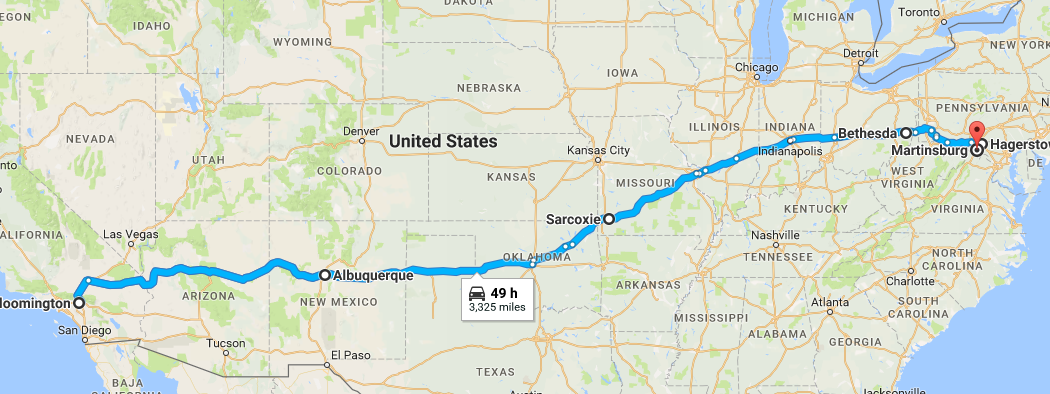 Bloomington, CA --> Albuquerque, NM -->Sarcoxie, MO-->Bethesda, OH --> Hagerstown, MD (getting close!)--> Martinsburg, WV where it goes to FEDEX Smartpost.