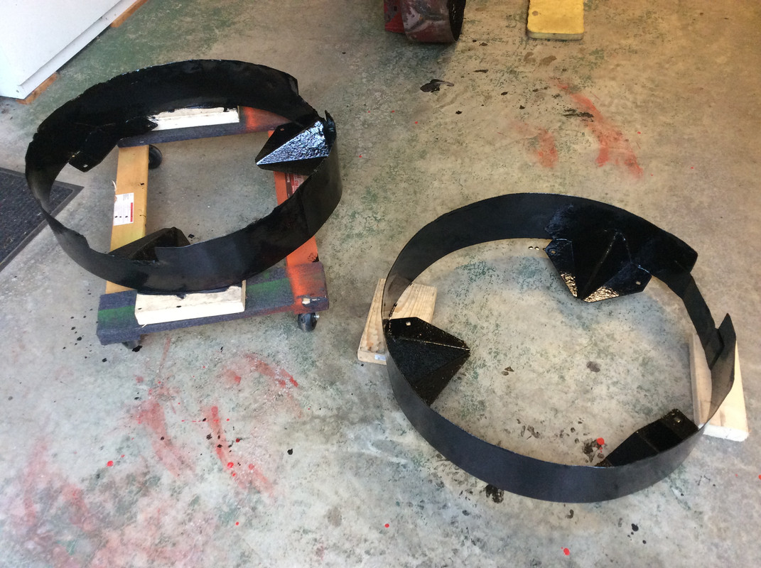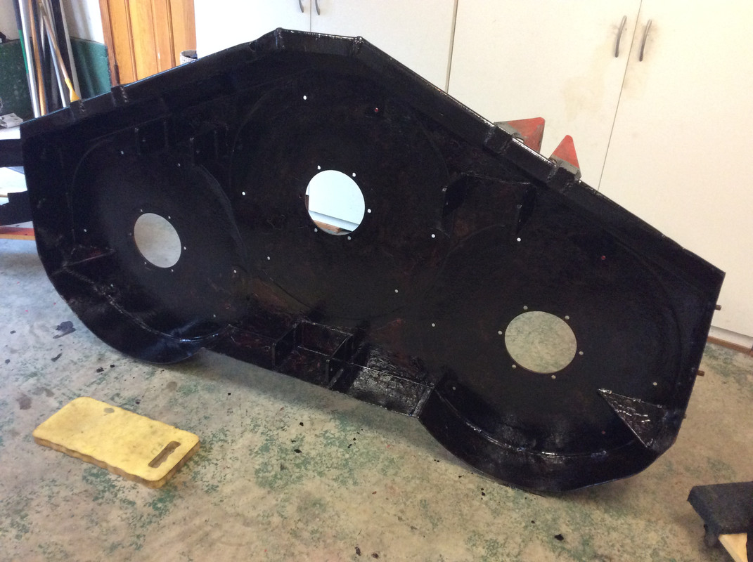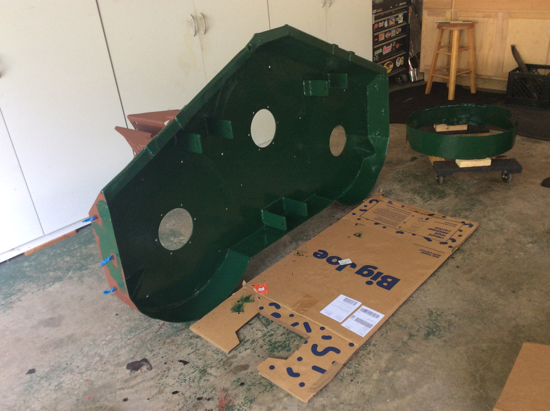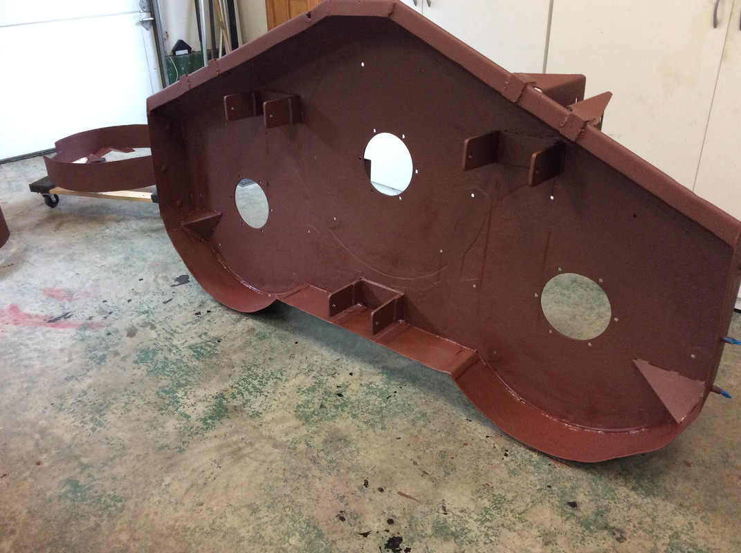Got some painting done on the deck with the por 15 epoxy paint on the bottom of the deck and the baffles. I wiped everything down with mineral spirits first, then wiped down everything again with acetone. This process has worked well for me in the past, and I have had no issues with paint peeling off.