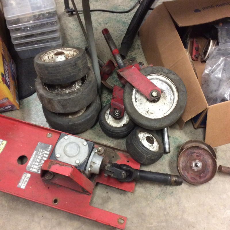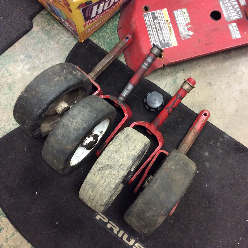 The rear tires will be the same size as the front on this one. I was missing one rear tire, and the other one was completely destroyed from no grease. New rear tires are $60 a piece, but I had several 10” tires in my stash with good bearings and such. Out of the four, two need new through bolts, and center bushings.