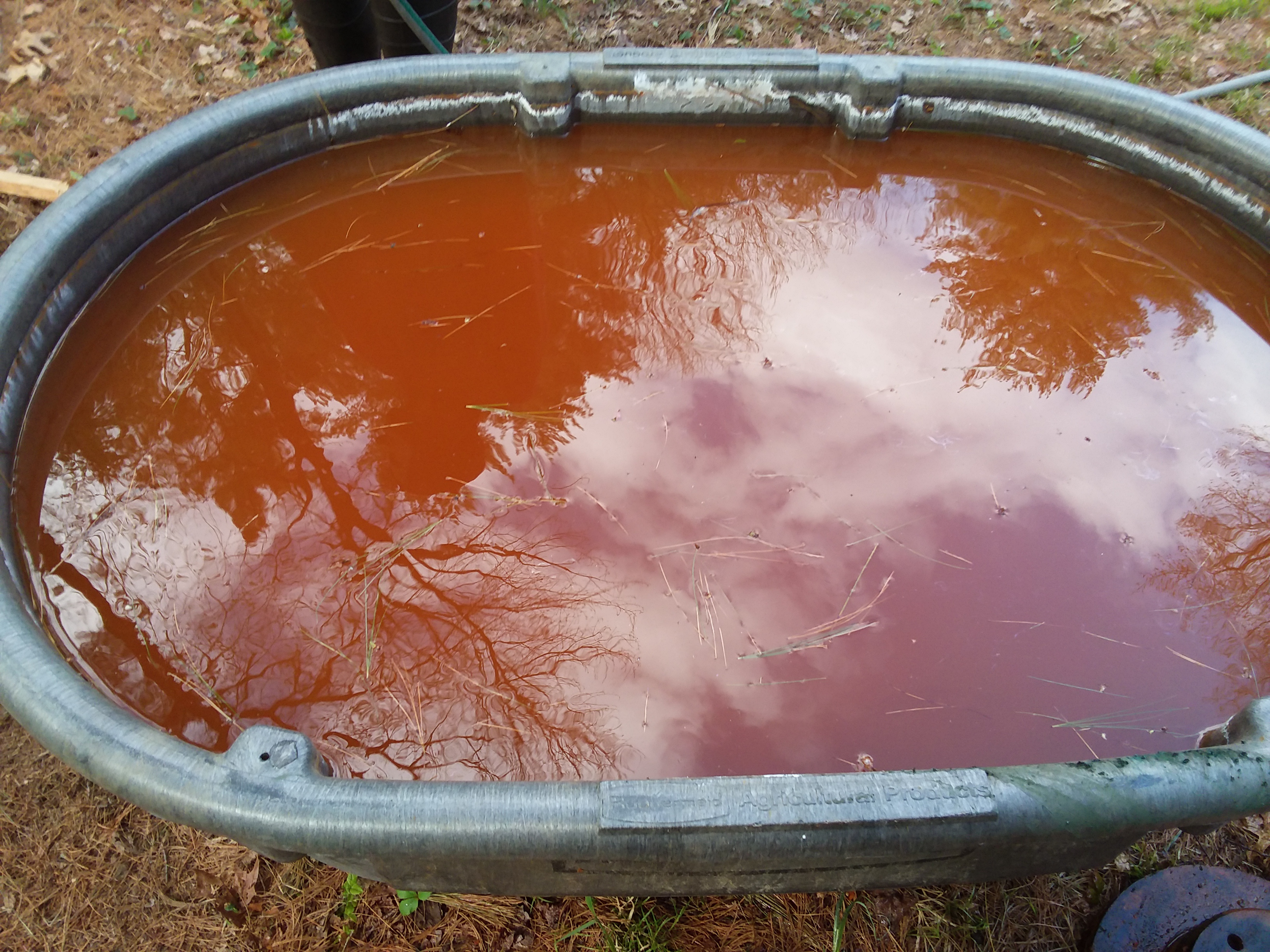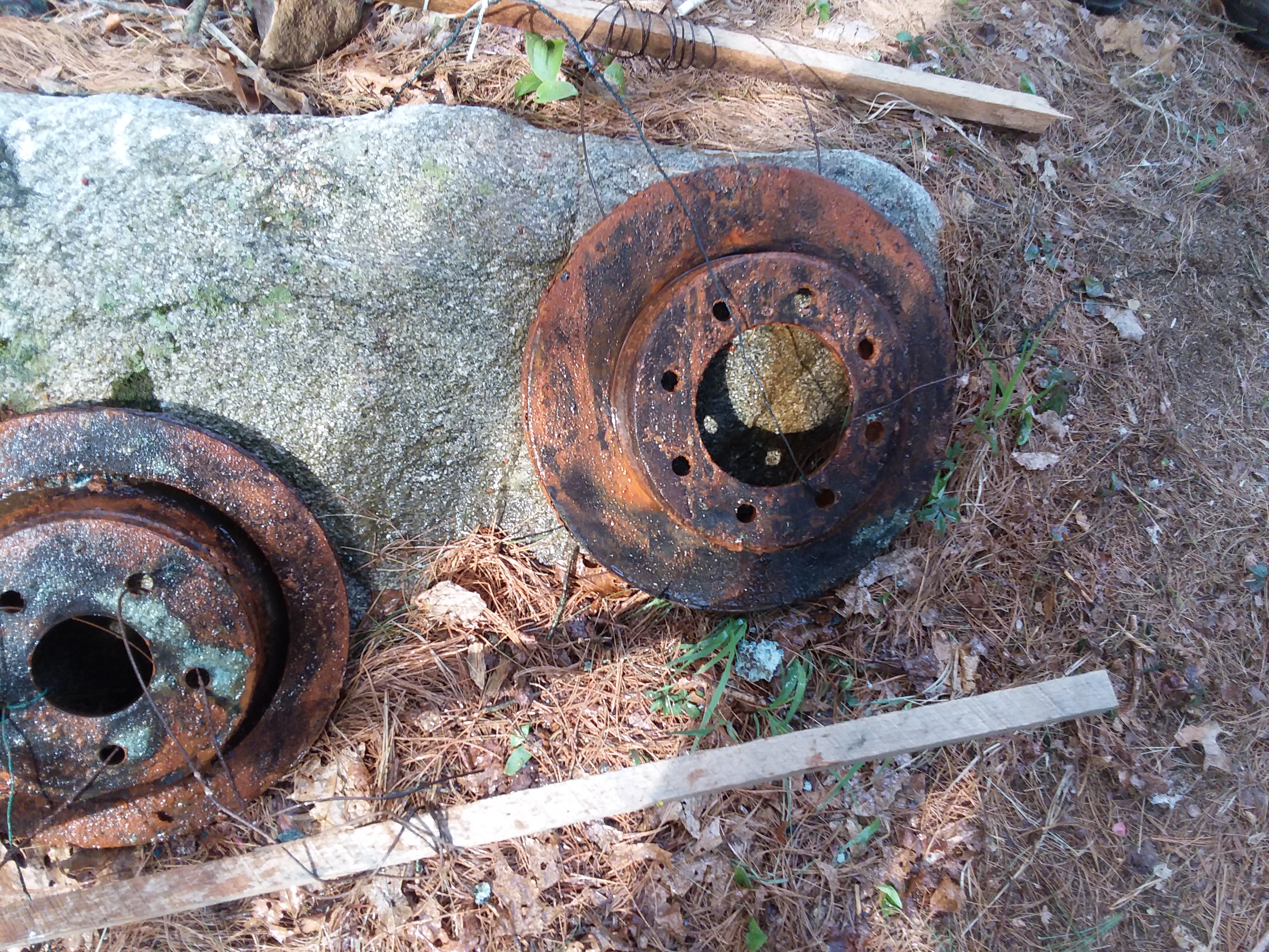 After a week of the first wheel sitting in the solution, I pulled it out and am pleasantly surprised at the results. The paint was bubbled and a garden hose using a jet spray took some good sized pieces off. I'll try a pressure washer next weekend after I rotate the wheel 180 degrees and "cook" it for another week. I took a few pictures that showed the water after 1 week, the rotors ( I did hose off the heavy gunk before I took the picture), and a few shots of the wheel.