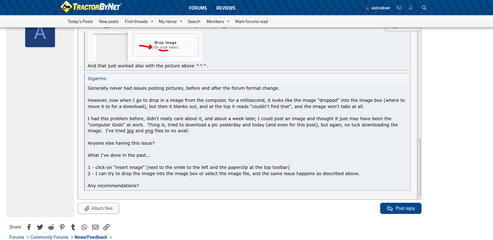 However, now when I go to drop in a image from the computer, for a millisecond, it looks like the image "dropped" into the image box (where to move it to for a download), but then it blanks out, and at the top it reads "couldn't find that", and the image won't take at all.