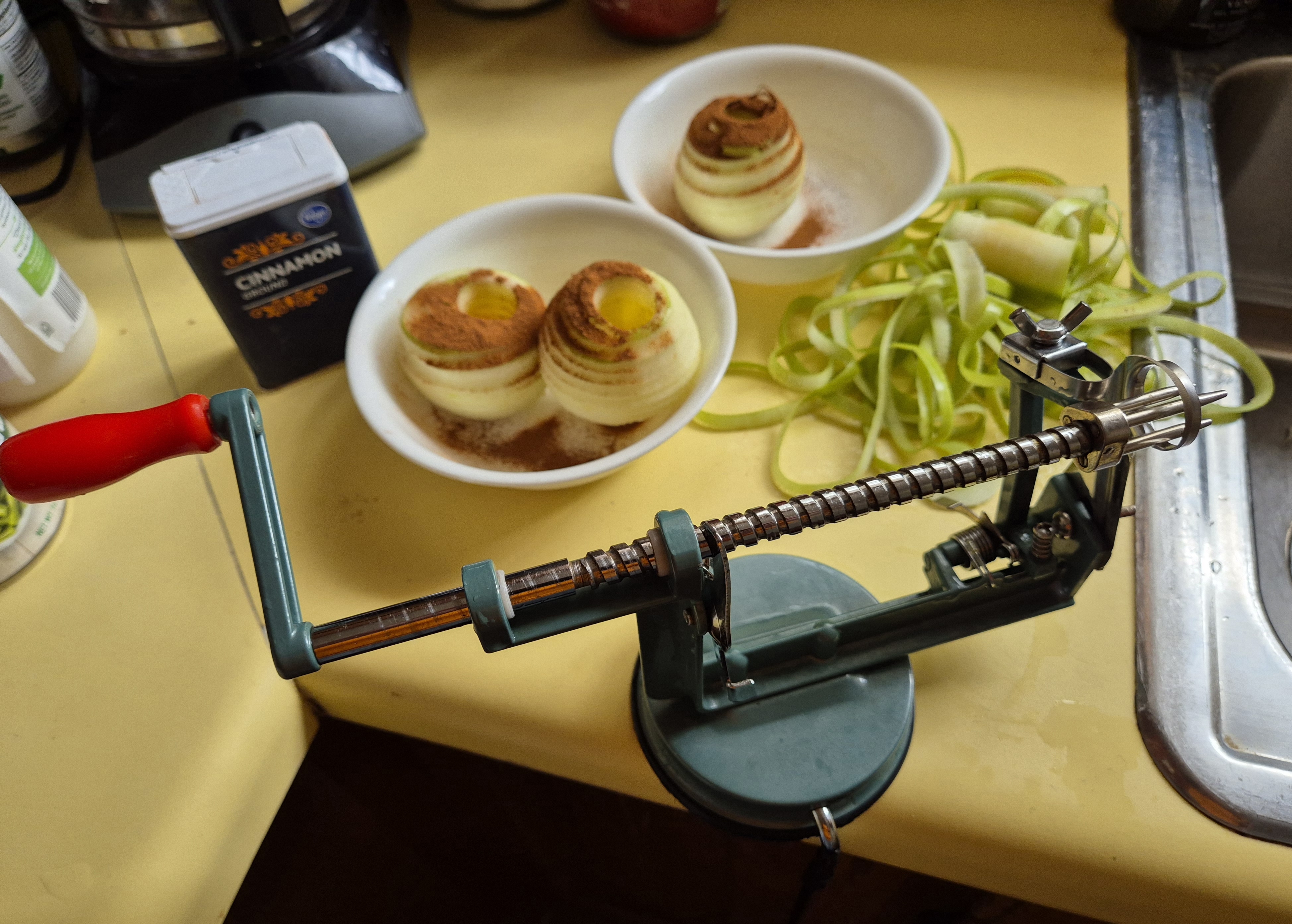 My wife does something similar. She usually bakes them in the oven though. Sometimes she'll put some of the "Cinnamon Red Hots" candy where the core had been.I can't cook, except make coffee & heat soup...but I used this apple peeler/corer, cinnamon, a little sugar, butter in center where core was, heat 2-3 minutes in microwave. Horses like peelings.![]()