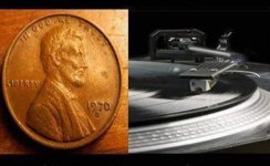 No one answered it, but I presume the penny was to put on the headshell of the arm for additional weight when the needle started to wear out, and records skipped. I used to use a nickel myself.