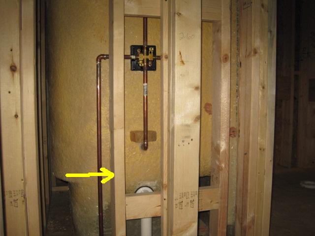 The first picture shows the shower on the right and a bathroom closet on the left. Here's a closer view. The yellow arrow shows the stud that would really be in the way if we ever needed to repair the plumbing later. The horizontal blocking is also in inconvenient spots.