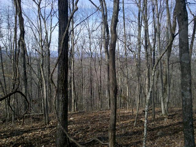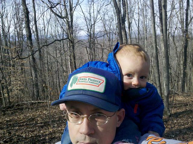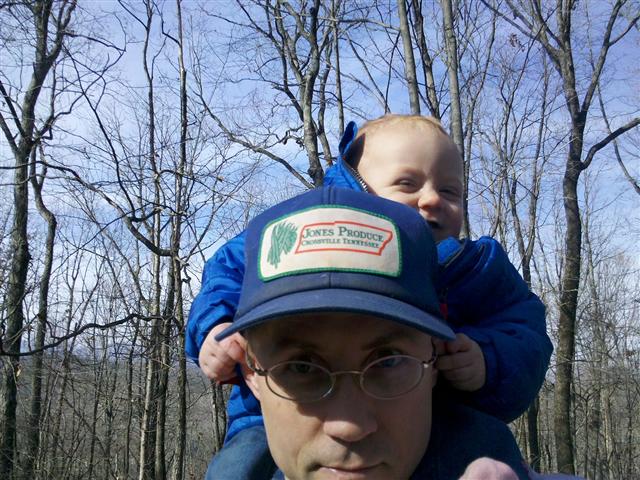 When she rides on my shoulders, she uses my ears for handholds. I have found that it's important, for the sake of my ears, to keep her fingernails clipped. You can see the Cumberland Mountains in the background through the trees.