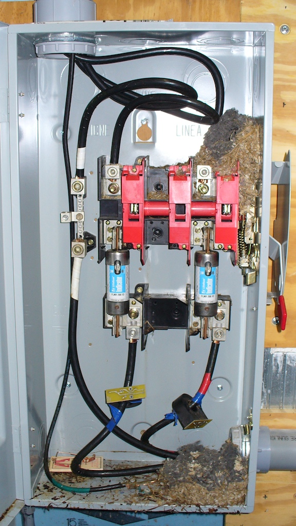 I didn't seal the end of the conduit that brought power in from my generator. One day in the basement I smelled "that smell". The picture is what I found. I had to take the switch apart and clean it all. I replaced the fuses in case they got anything in them. What a mess... I still have to take the transfer switch apart, it has one area that got peed on. I ordered the conductive grease for that, so that should happen soon. I'll also check and grease the moving part of the disconnect switch.