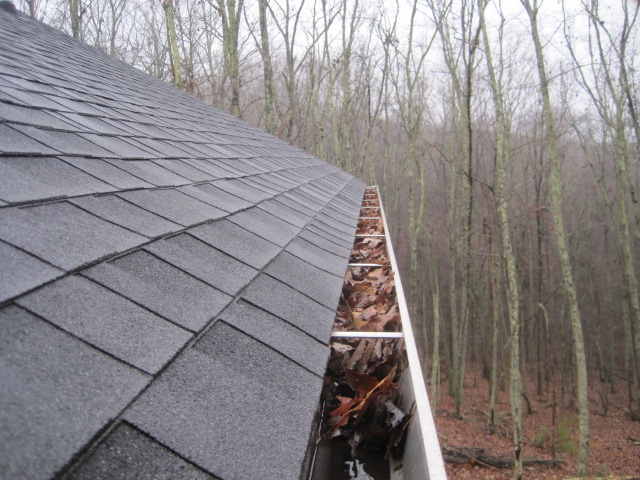 Here are pictures of the one of the gutter guards on the rental house. They did a reasonably good job of keeping leaves out of the gutters. However, they tended to keep the leaves from sliding off the roof. The leaves would get caught on top of the gutter guards and then pile up on the roof.