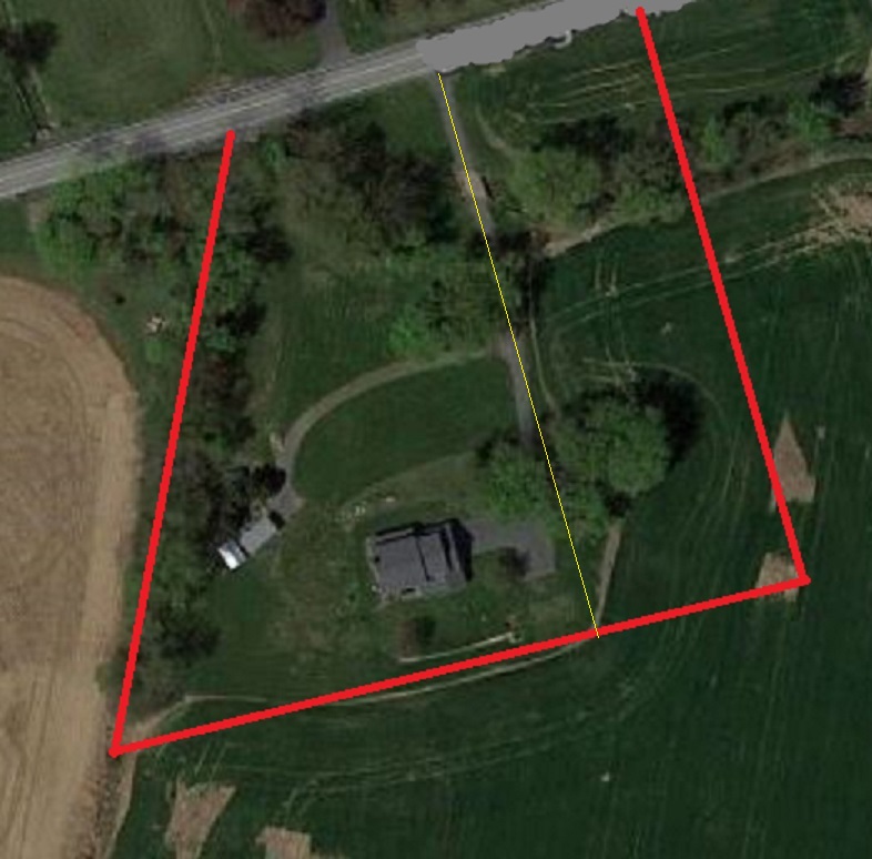 Here's a satellite shot of our place taken before we planted the extra grass. The original lot stopped at the yellow line. The creek is hiding under trees, but you can see the bridge out near the road. I was pleasantly surprised to see the increased mowing capability brought by going from 21 HP to 32 HP and from a 60" deck to a 72" deck.