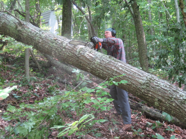 I then tried to cut the trunk about 10 feet from the root ball thinking the tree would fall to the ground. Nothing doing. The angular force of the top of the tree just pushed the two pieces of the trunk together. In fact, the tree trunk started raising, not falling. Next step - go watch youtube to get some instruction on how to bring down a tree leaning against another tree.
