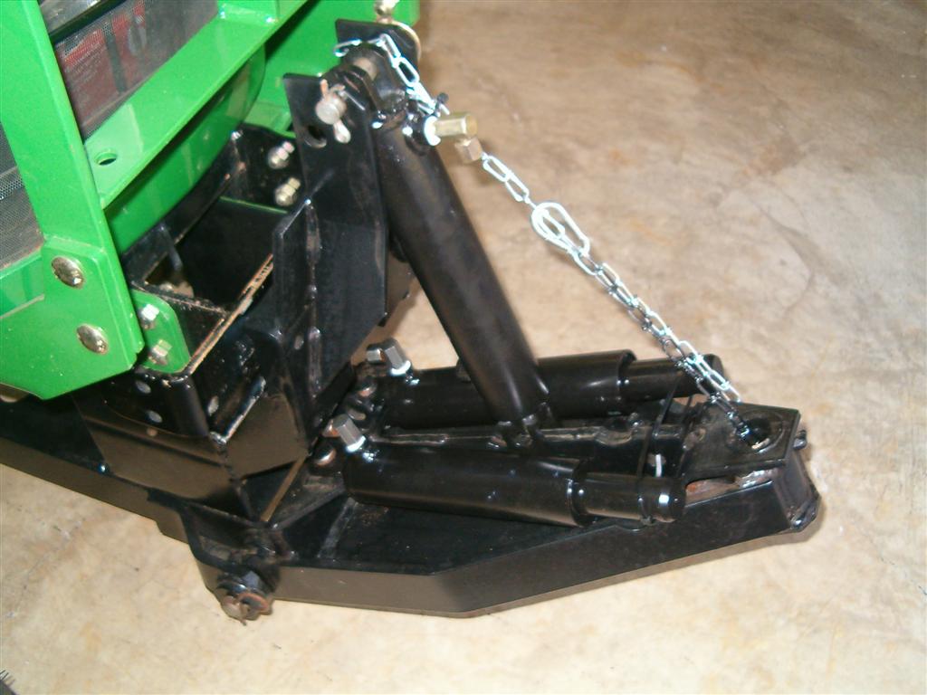 Here is YOUR tractor with a 7.5' plow on it. All it took was the 2 'pork chop' brackets used to mount a mid mower, two square tube arms that go forward and downward to pick up the 2 'A' frame points and a short lift cylinder dropped from the front radiator guard/front weight bracket. I use the hydraulic outlets for the loader (incl. power up and down). The cylinders are stock plow truck parts from TSC or whereever. With the 1070's flow and pressure, you can toss snow laterally just by swinging the blade left to right.