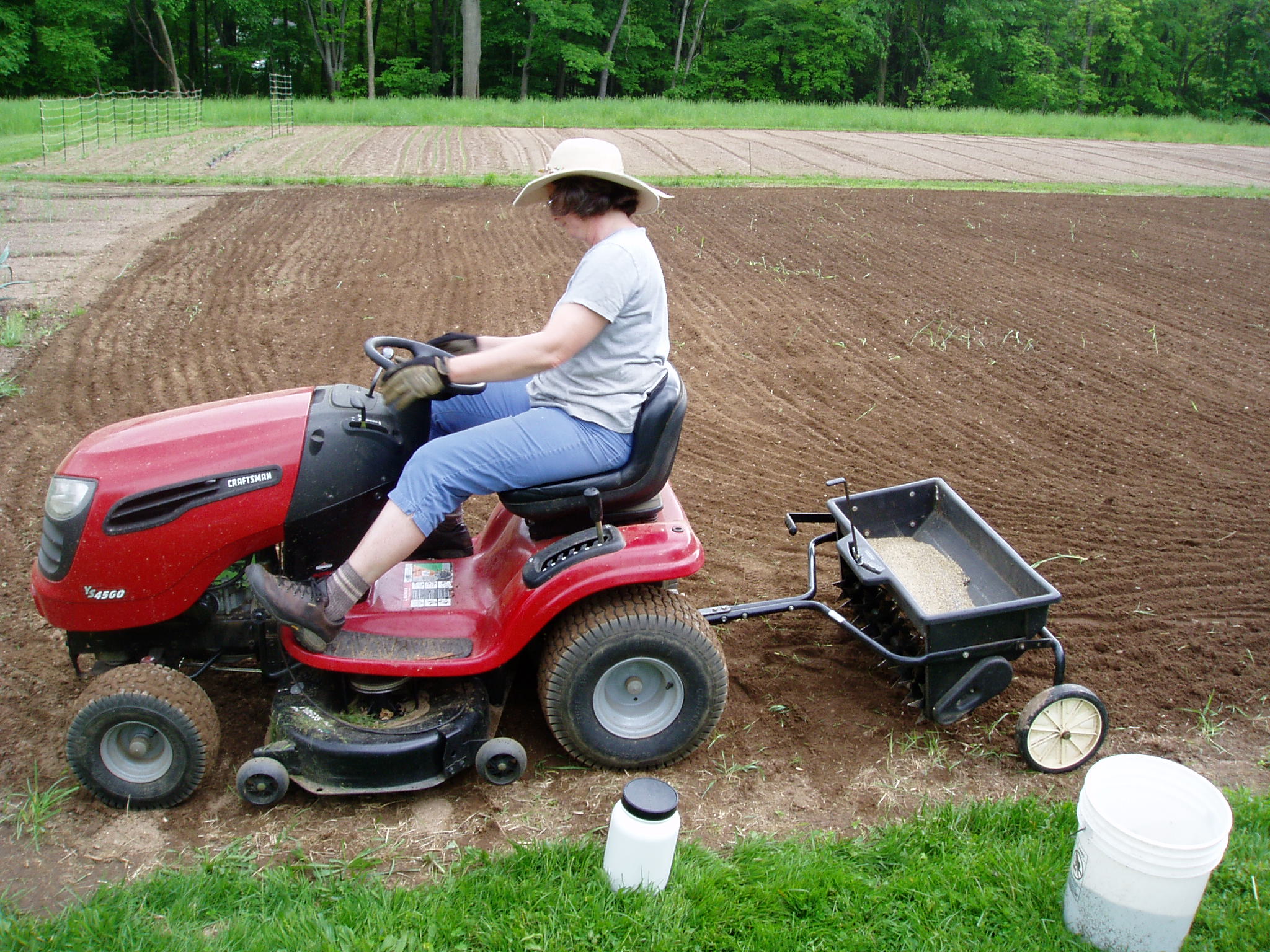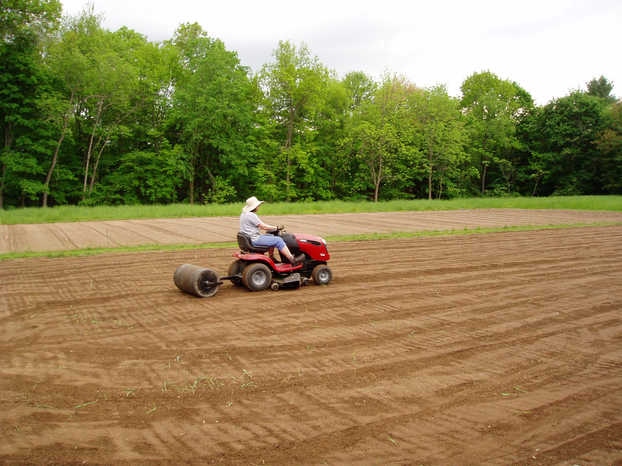 I tilled and The Plant Manager rolled the plot last weekend - then it rained for 5 days. I think we need to use less water in the roller next time, or make sure we rake before it rains, as the soil got packed way too hard. This made for tough work on the rake, requiring several passes with increasing ballast loads to get the teeth to dig in. We're still learning. Since the plot was over-packed this time, no need to remove the deck. Next time I think I'll try attaching the drop seeder to the back of the rake so we're dropping all the seed in the raked grooves and none on the tractor's tire tracks.
