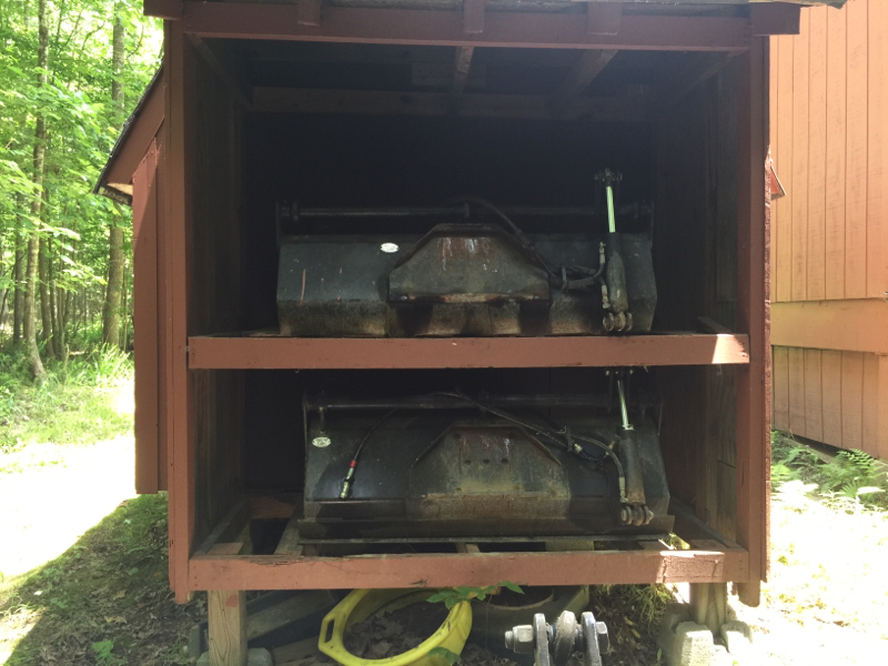 I used to keep all my attachments inside a shed. It was easy to put the snow plow in up against the back wall, then the brush cutter, then the small and large buckets (nested) with the pallet forks and misc small attachments in them resting against the back of the brush cutter, with the 60" mower on the PT and rested down on top of it all. That took up about 15' in a 17' shed, so I still had 2' to walk behind it all. Well.... the wife wants to keep the nice car in the garage, so I had to put the stuff in the car garage in the tractor shed, so the tractor shed is now the stuff shed and the implements sit outside behind the garage. I still stack them up to save space and trow a tarp over the top of them. That keeps the rain off. But its not down to the ground, so moisture evaporates and nothing has rusted to speak of, with the exception of one castering wheel tube on one of the attachments (can't recall which one) that made it just about impossible to get the caster pin out. Had to heat and beat for hours. Keep 'em greased fellas!!! :rolleyes: