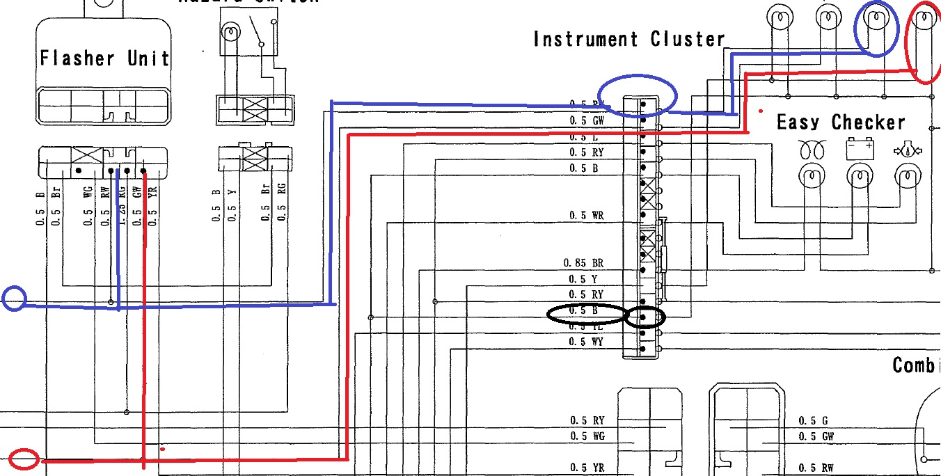 This is what I found when I checked the wires going to the flasher unit The B wire and the Brown wire are stripped...