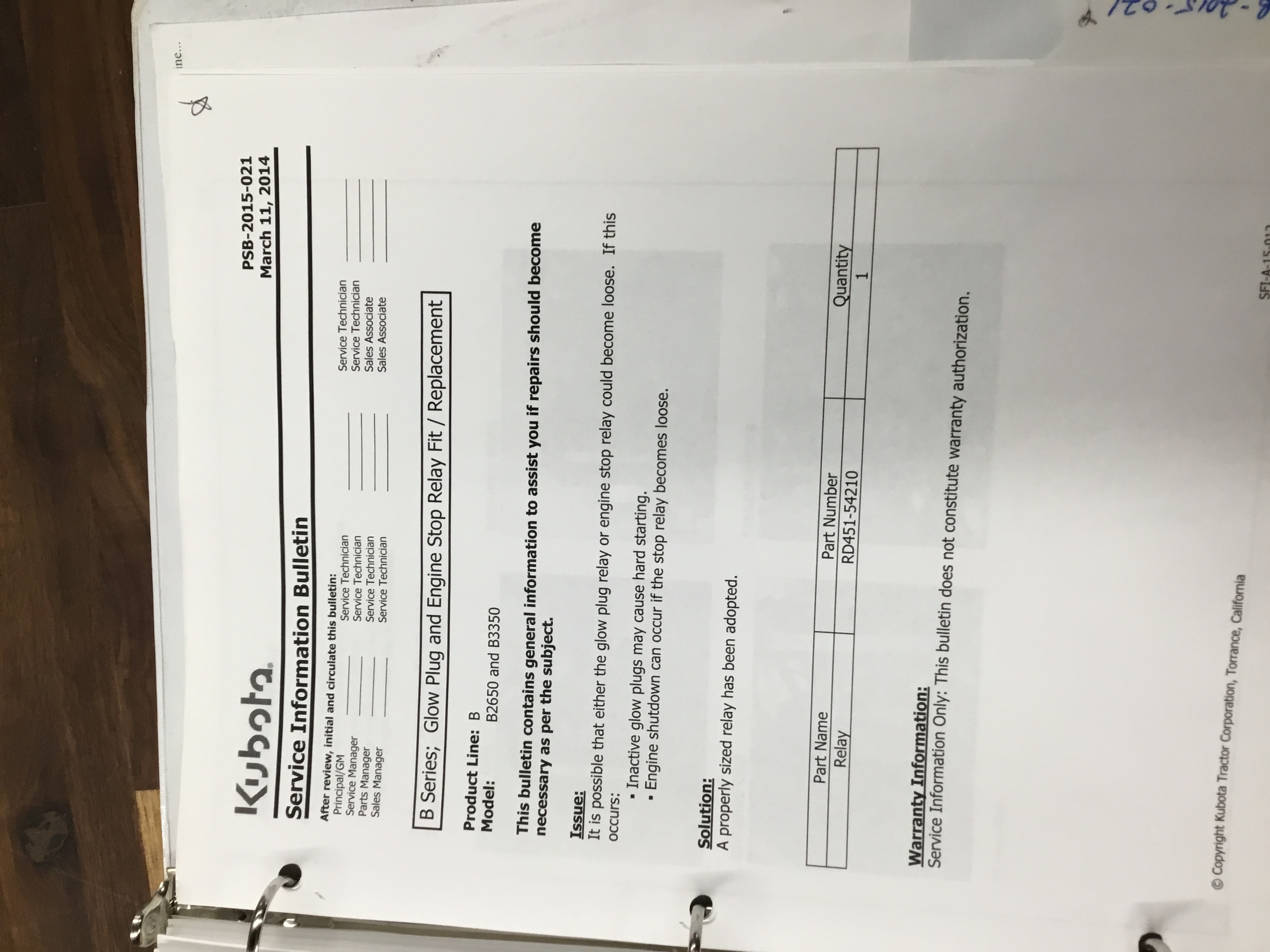 Randy, my B3350 died in the middle of a icy road. I had to tow it back. That was my first exposure to regen. 3 times back to dealer for revisions. They have a 2 inch 3 ring binder on my tractor. Mine died once last fall when I was just towing a chipper and went to move to another location. I had to wait like an hour and then the key would let it turn over ( computer crap). I have an early b3350 and recommend you push your dealer into learning more about them. I could photo the pages of my " book" at the dealer ( I think , they'd let me ) and email to you. PM me if interested. Maybe they would help your dealer?