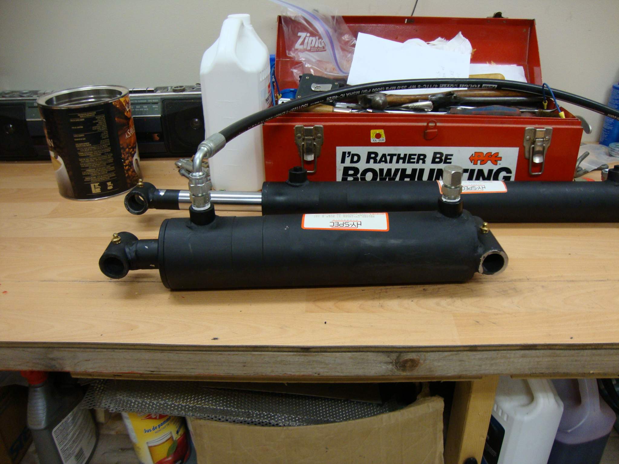 Original cylinder was a 2x18, you could overextend it when right angling, which was how it got bent. The new one is a 3x10, full extension and retraction = roughly 30 degrees of angle each way and no risk of damage. I had to re-position my attachment points to make it work. The bend in the 2x18 rod is visible in this picture.