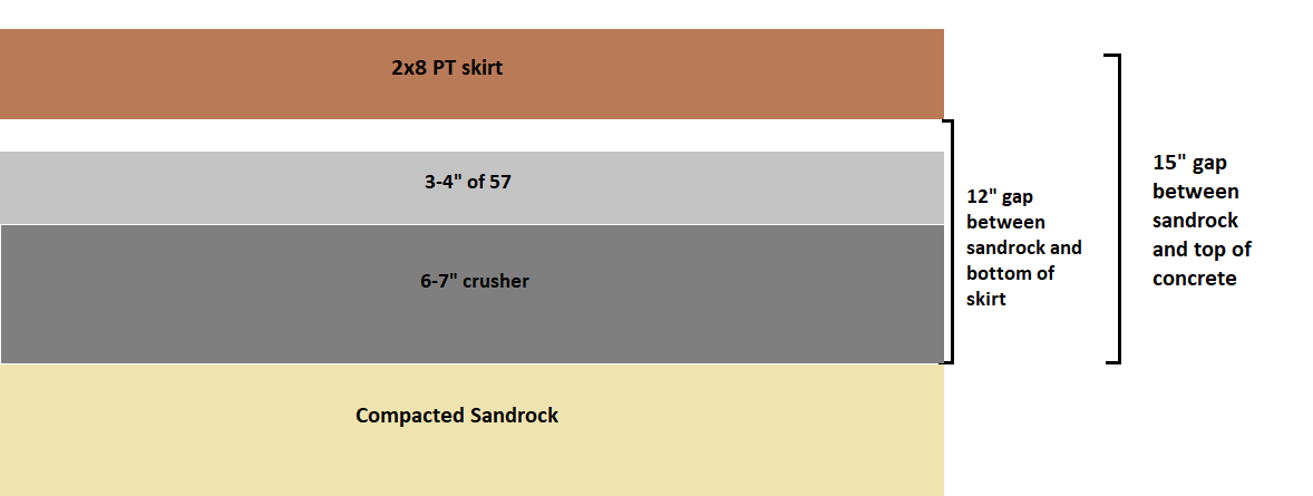 I put together a crude drawing in MS paint to show the fill I need. There is 15" between the sandrock pad and the spec'd finished TOP of the concrete. I plan to go with a 5" slab so figure 15"-5" leaves 10" of fill needed. The concrete guys want a few inches of 57 under the concrete but didnt recommend putting 10" of 57 as it would be too unstable. So figure 10" of fill - 3-4" of 57. That leaves about 6-7"inches of crushed concrete/crusher/etc. needed.