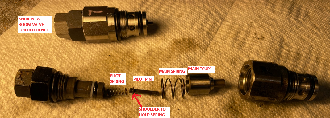 I was able to remove the small spring and reseat it on the pin shoulder and reassemble the pressure relief valve. Now the pin moves freely and I could easily push it the circuit open with my finger just like the new spare unit I had. I put it back on the tractor and sure enough, the backhoe is as good as new. The story here is that if the pressure relief valve is stuck open or the spring or the small pin is broke, your system pressure when trying to swing the boom will just go right to the hydraulic tank. The good news is that it is very easy to remove, disassemble and inspect. In my case, if I had know, I could have fixed with just 2 wrenches in 10 minutes. Now I know and will not be afraid to remove the pressure relief valves and take them apart if needed.