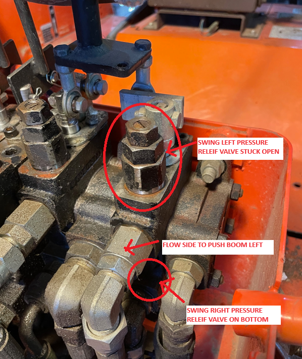 I could swing the boom to the left but not to the right. If the tractor was on a slop leaning right, the boom would slowly move to the right indicating the pressure relief valve was open. Many people have suggested shaking the backhoe with it tilted the other way using the outriggers fixed their problem which would apparently unstick the pressure relief valve. I tried that for 10 minutes and high RPM's, low RPM's, using the outriggers to shake the tractor left and right, shaking the boom while trying to swing it and nothing I did fixed the problem.