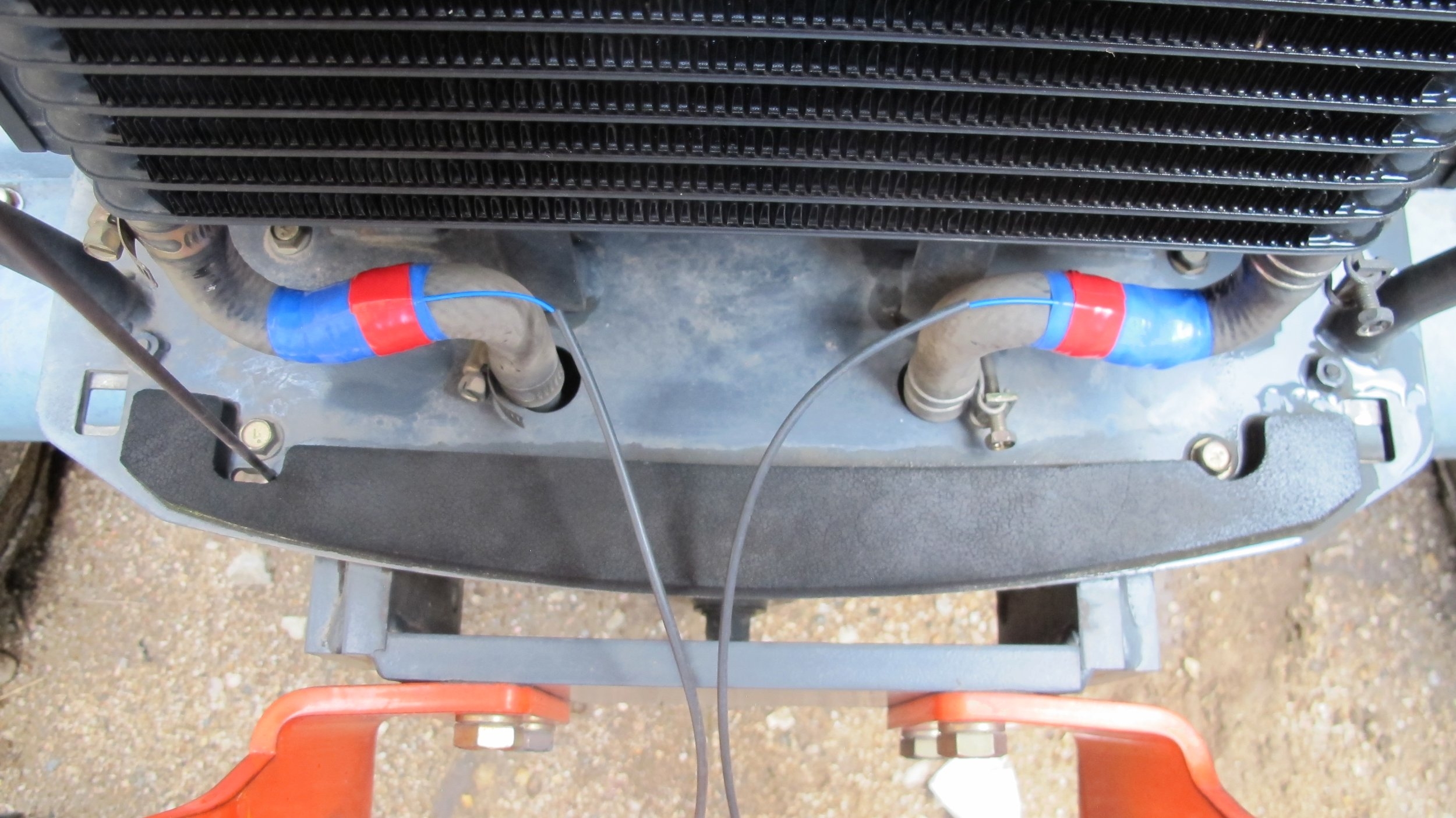 Today I cleaned the radiator cooling fins for engine and hydraulics. It was about like I expected, having not cleaned them in about 12 years or more. Anyway, just for fun info I also installed a gauge to compare hydraulic fluid temperatures entering and leaving the fluid cooling radiator. The temperature senders are external. The senders are just taped to the hoses after being coated with thermal mastic and insulation. Be interesting to see if this simple approach tells us anything.