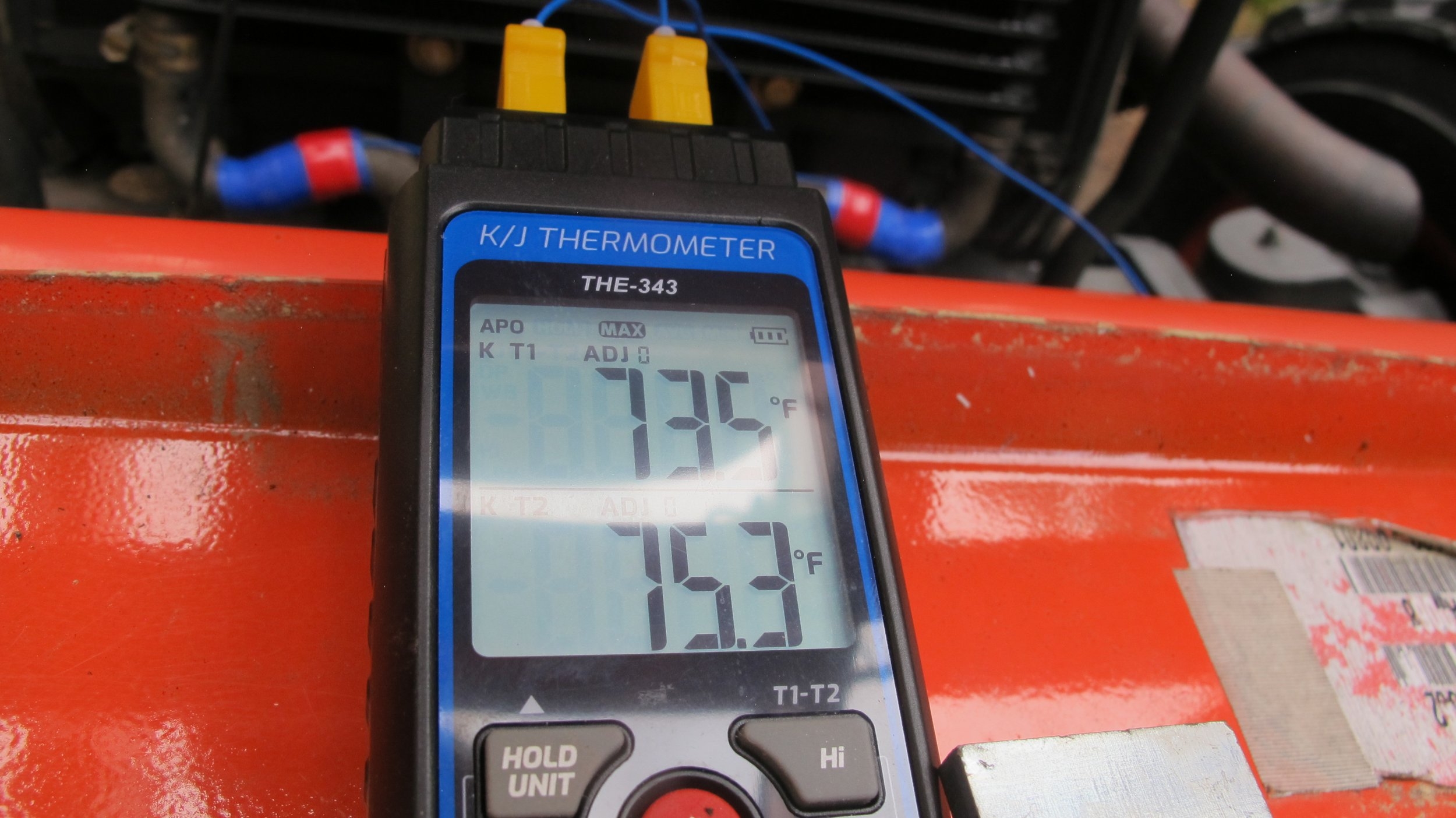That would be a good test. When mowing I have clear the radiators and screen several times a season. Curious what temperatures might be seeing. That’s usually the hottest I see the tractor.Today I cleaned the radiator cooling fins for engine and hydraulics. It was about like I expected, having not cleaned them in about 12 years or more. Anyway, just for fun info I also installed a gauge to compare hydraulic fluid temperatures entering and leaving the fluid cooling radiator. The temperature senders are external. The senders are just taped to the hoses after being coated with thermal mastic and insulation. Be interesting to see if this simple approach tells us anything.