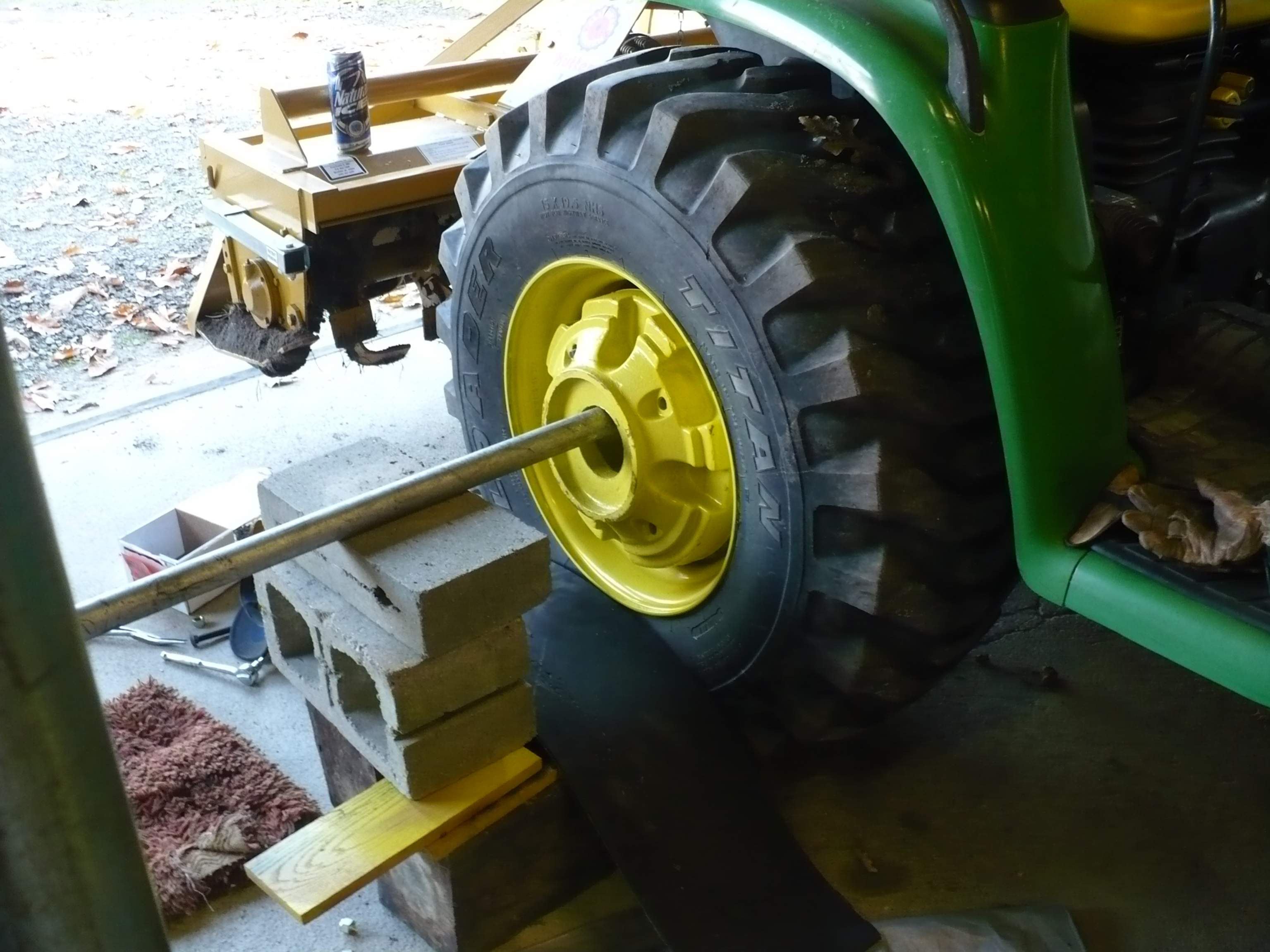 The tires I have wanted to turn for max width so I did so and put them on the opposite sides to correct the R4 tread grip. Valve stems inside. I got lucky, no damage, also it should be noted that the gap between the wheel hub and the tractor is wide and not super tight like the front wheel asm. I jockey the 250lb tires/rims ok and wonder if my older body could handle the +400 to +500 additional of Rimguard. I think I better play with fancy old wheel weights.