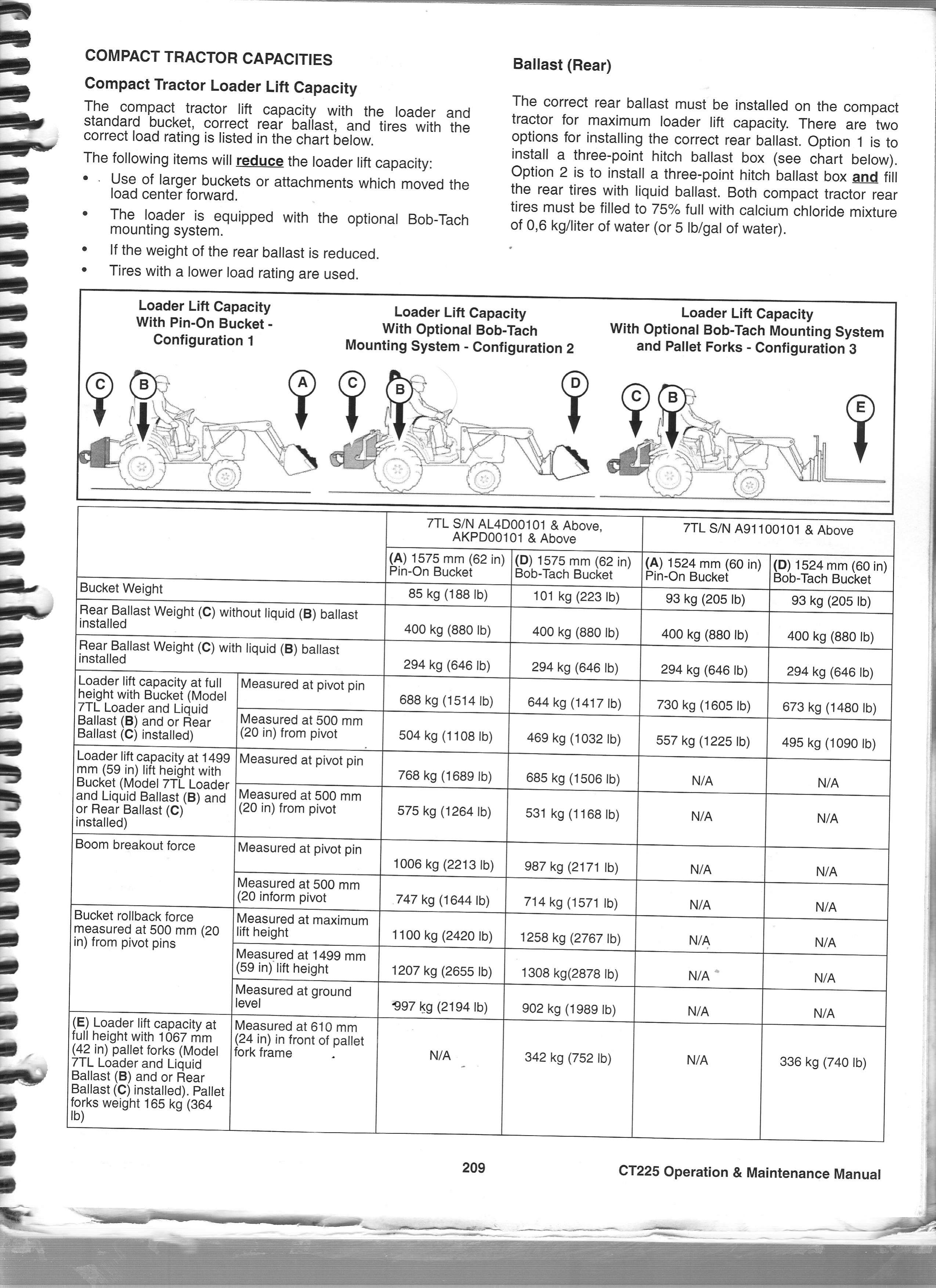 I can't speak to your tractor, but my tractor's user manual explicitly says that the rated load is dependent on rear ballast being present, and that reducing or eliminating rear ballast will reduce the lift capacity. The point is that the tractor HAS been designed to support the rated load, but ONLY when ballast is present. Many full-size tractors and loaders are designed to achieve full lift capacity without additional ballast, but most (all?) compact tractors require additional ballast to safely achieve full lift capacity.