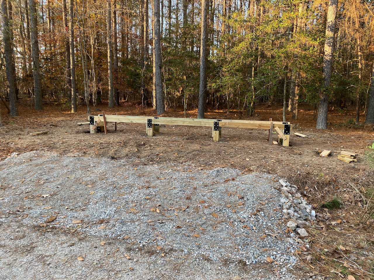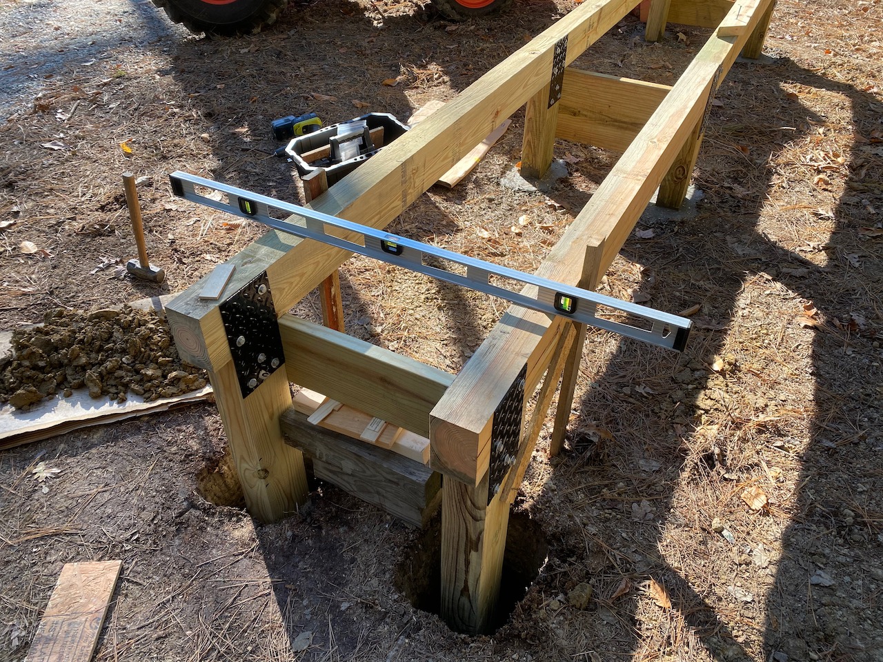 I pre-fabbed each of the three sections in my barn on the concrete floor, to get everything nice and square, then carried each section to the site and blocked it up over the post holes to level it prior to pouring concrete around the posts. The posts go down 17-20" (below the frost line of 12").