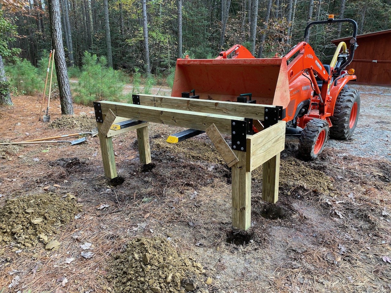 All made with 4x6 timbers. I used scraps for the leg posts and just had to buy timbers for the tops. Cross-braces are also scrap lumber. All the gusset plates are scrap diamond plate steel, and it's all held together with galvanized 5/16" lag bolts. So I spent $100 on timbers, $35 on bolts and washers, and the rest I already had. Some people think it's stupid to keep 2-3' scraps of lumber but I always hang on to those pieces and it came in handy here.