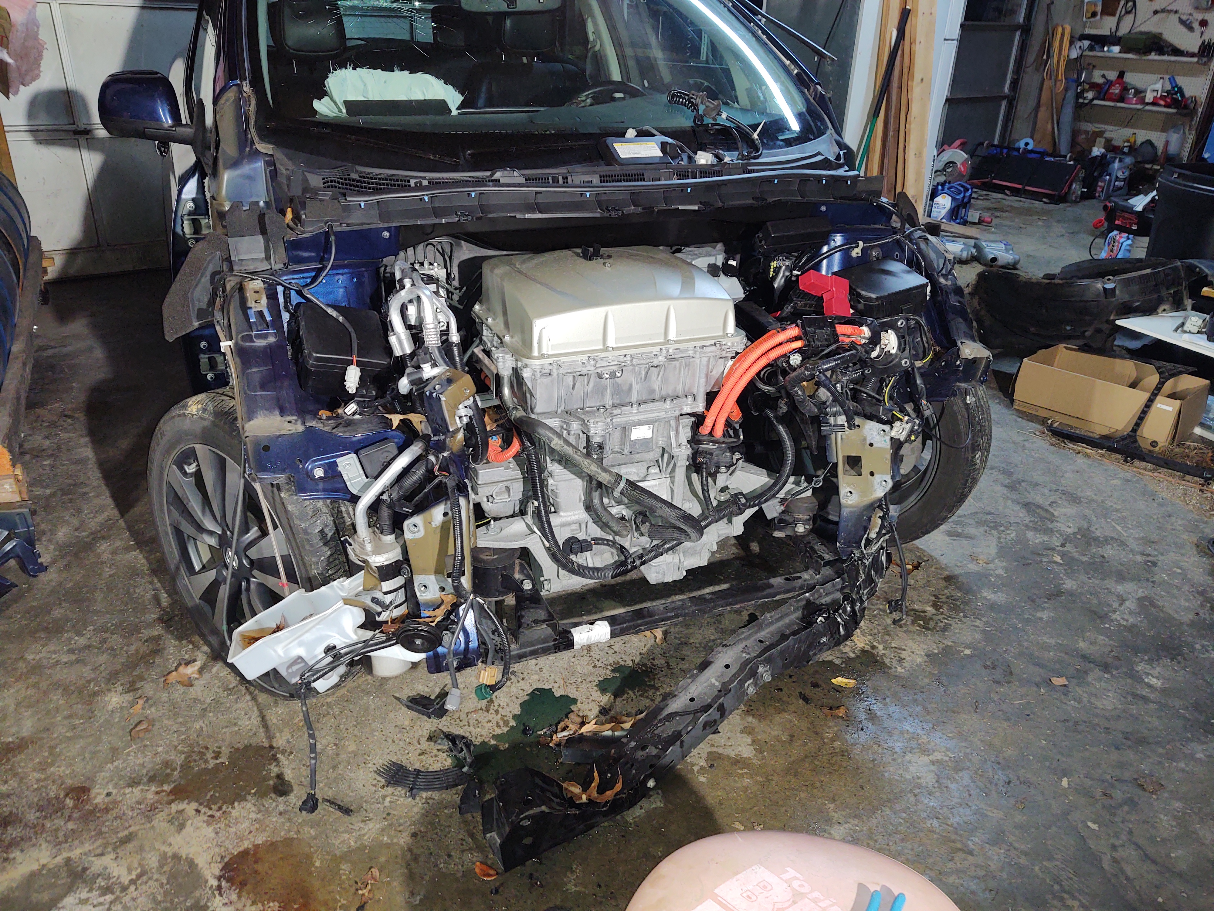 This is our 2016 Nissan Leaf SL after a guy ran a red light and Austin and I removed optional parts. We took it for two mile run getting it up to 68 MPH and it ran and handled fine thankfully and shows no sign of frame involvement thankfully. The 18 year old guy running the red light sheared 18 inches off of the nose missing the tires by about 6 inches.