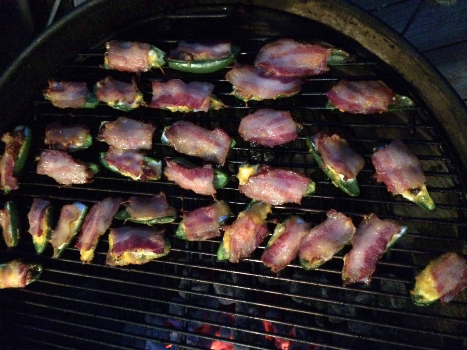 ABT's - jalapeno peppers stuffed with Italian sausage, cream cheese, cheddar cheese and topped with bacon.
